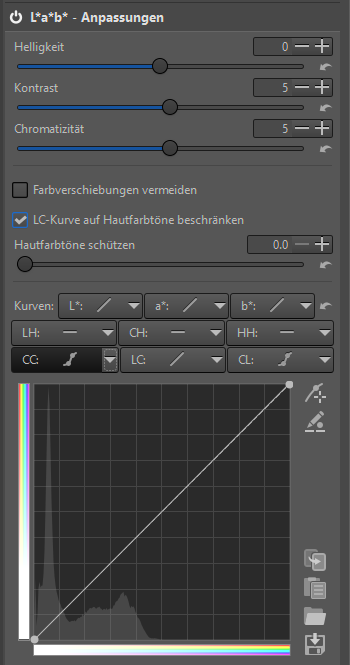 The LC curve (lightness according to chromaticity) allows to control the output lightness based on the input chromaticity, L=f(C). You can use it on portraits to lighten skin