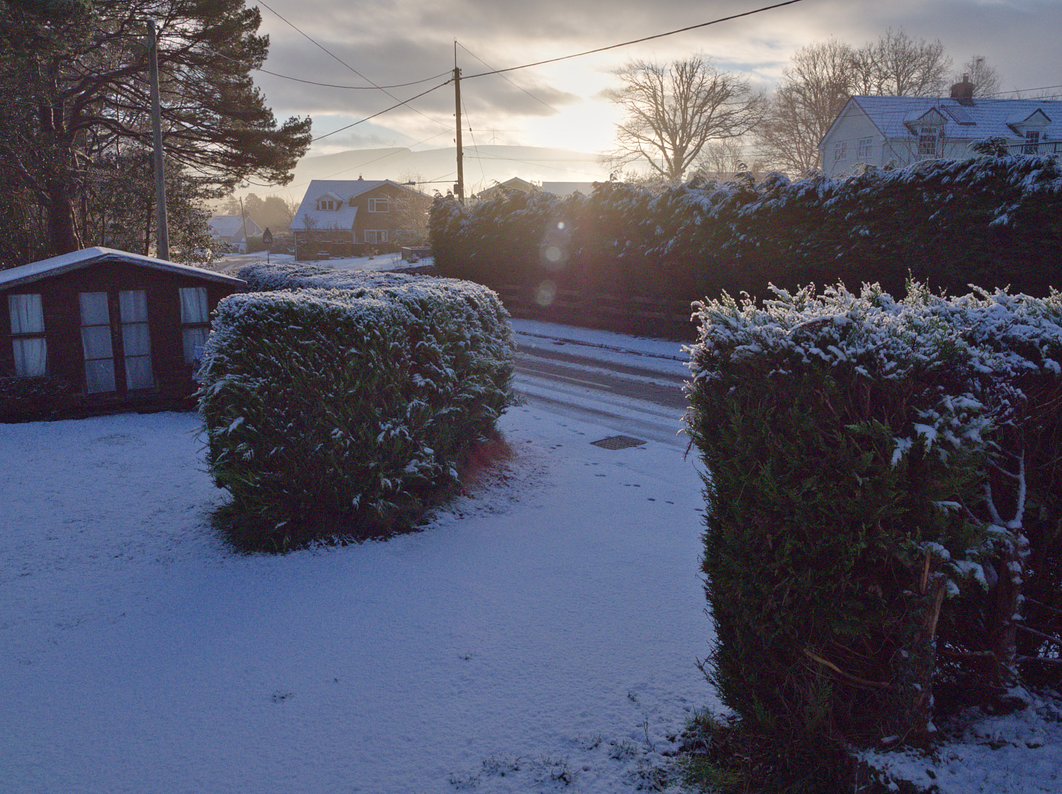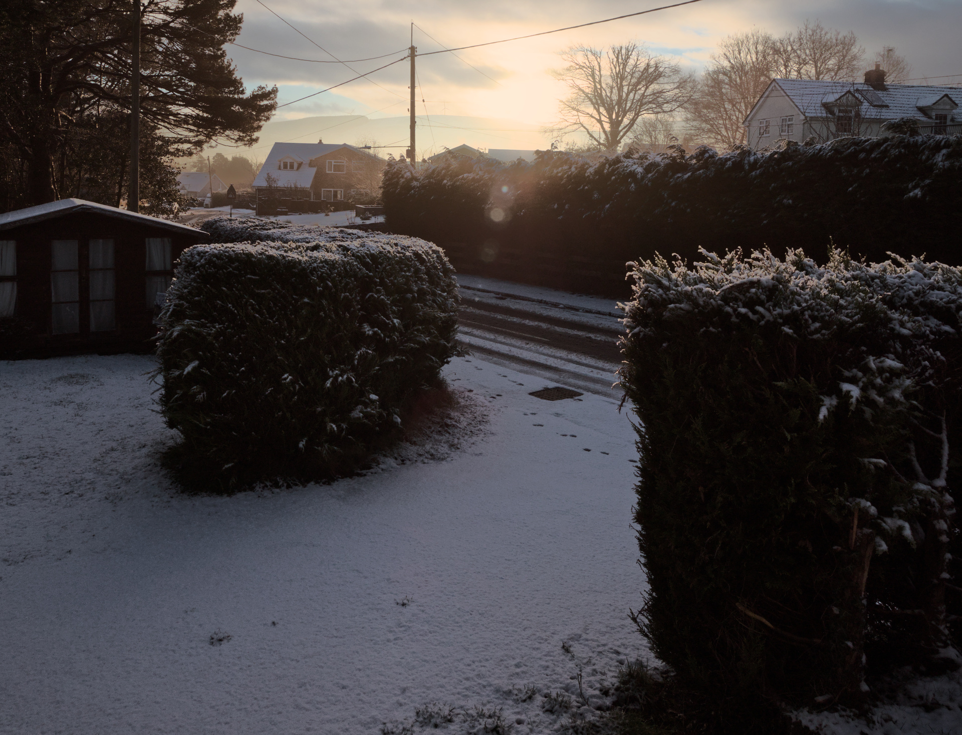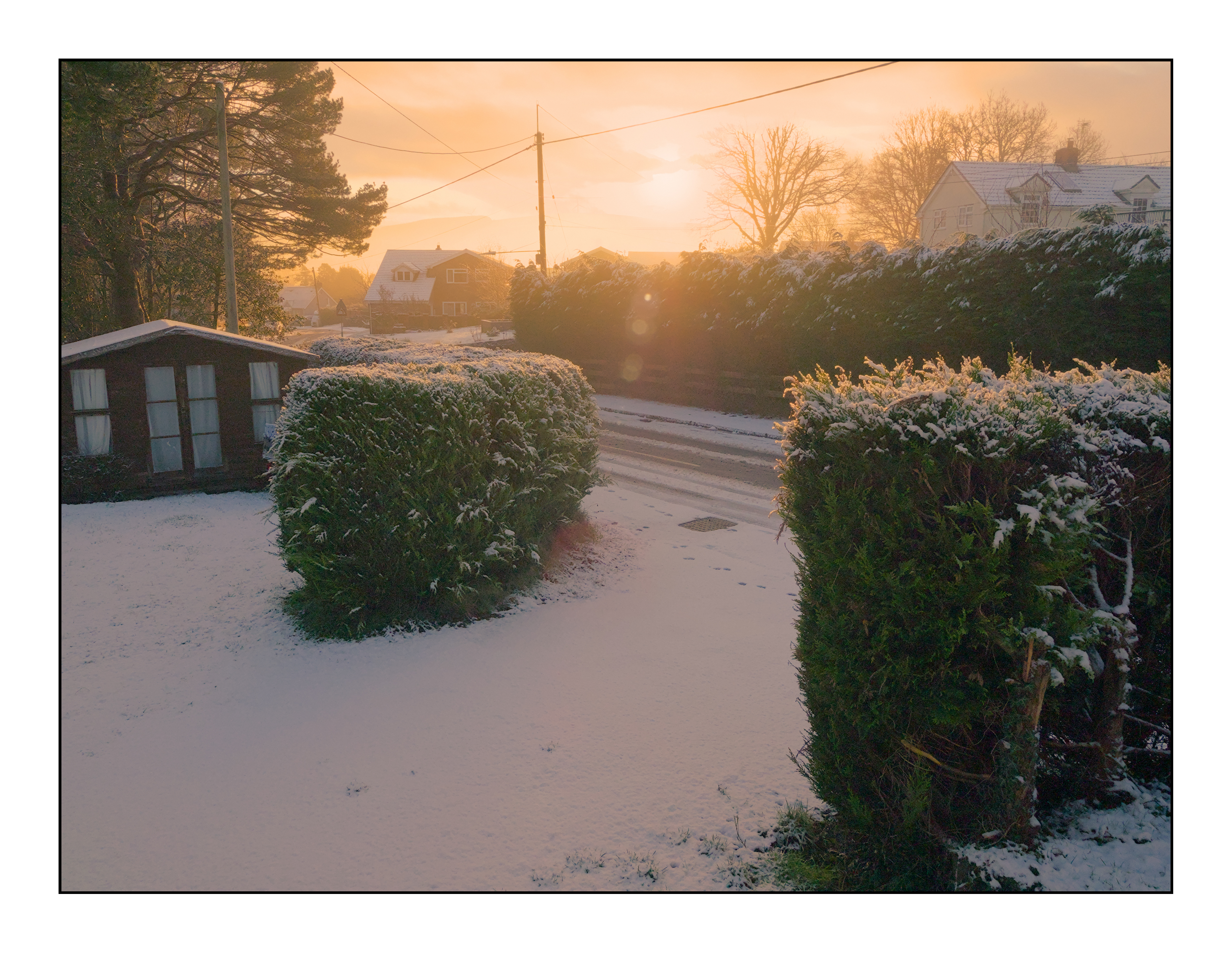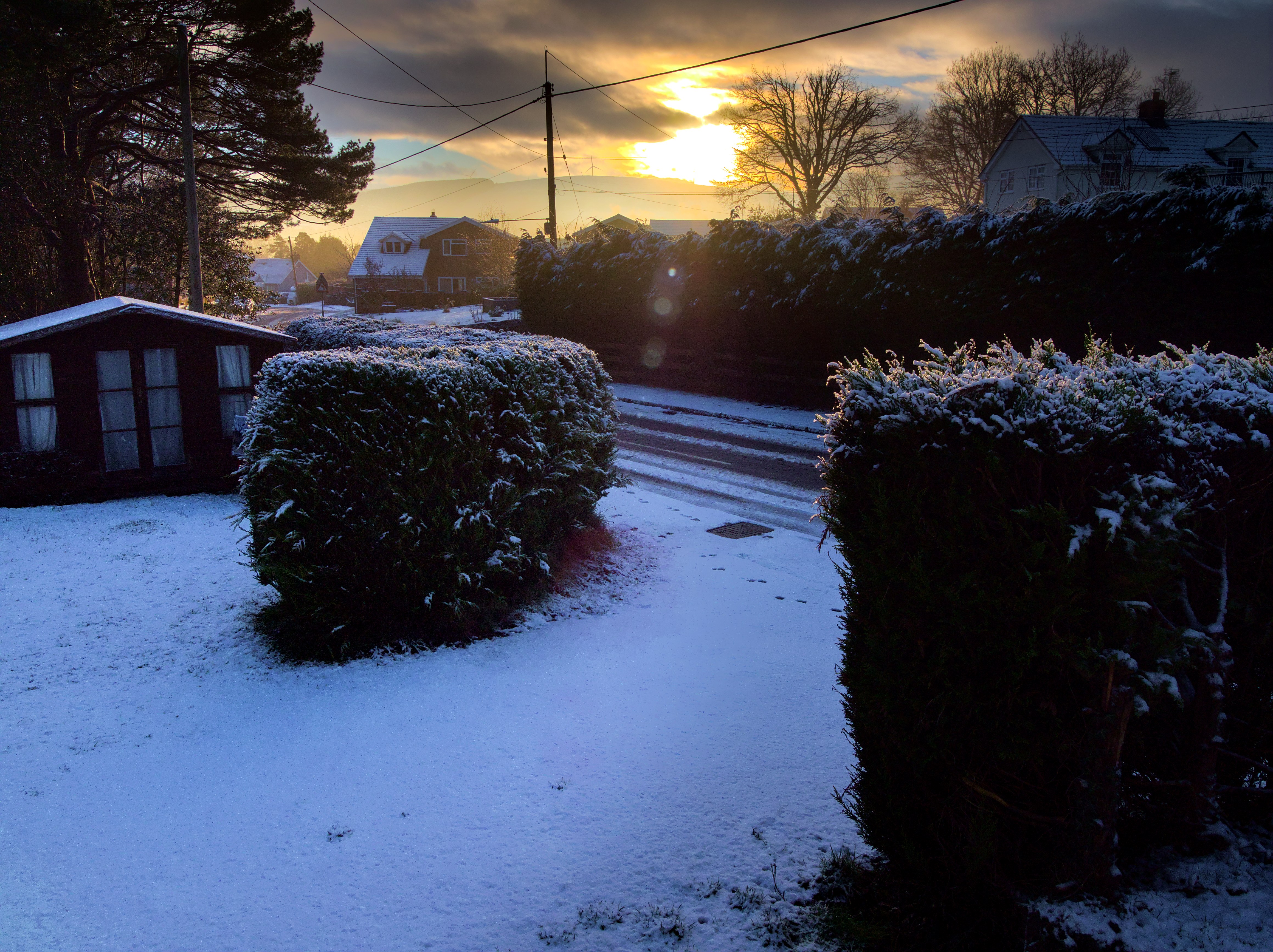 Hi, my tuppence worth. I tried to remove the worst of the lens flare, show some texture in the foreground conifer hedge, keep the over all colour bluish to give that cold feeling whilst not loosing the orange tones of the sun.