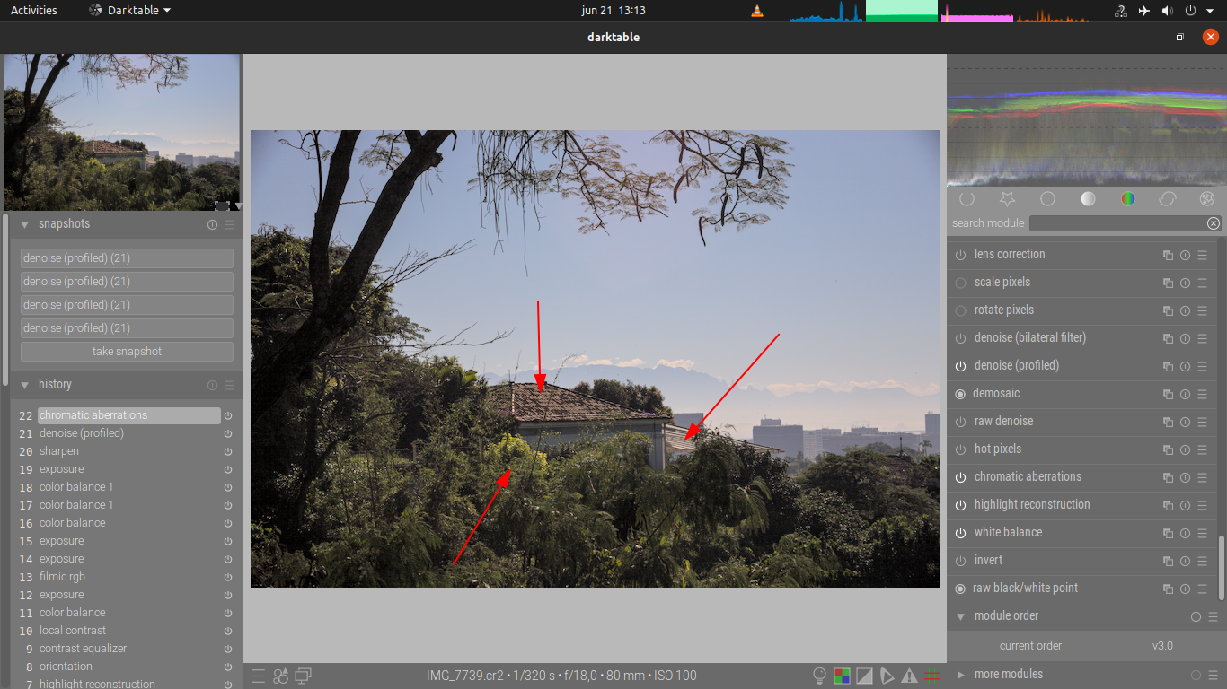 It seems to me as if the module doesn’t apply the effect only to the high contrast borders, where we expect to find the chromatic aberrations, but spreads into flat regions of the image.