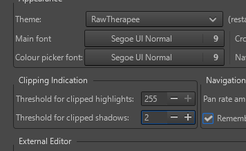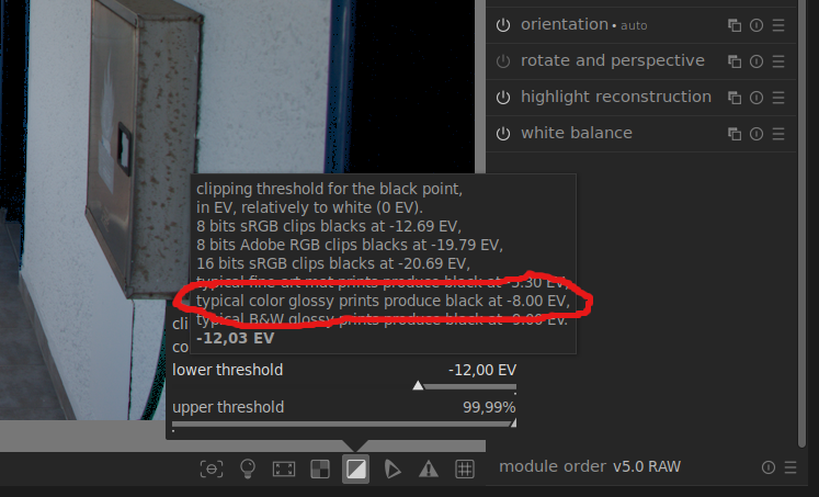 I completely understand you. For those of you who print photos, it is important that they look good when printed. But most of us who are into photography never print our photos, but rather view them on a computer or publish them on the Internet, and for us the most important thing is that they look good on the screen, not on paper. In darktable, this is solved simply, you just need to hover cursor over the indicator and the explanation is there, you set when the shadow will be clipped depending on what you need. The explanation for the shadow values in rawtherapee doesn’t even exist in the instructions on rawpedia. If the value 8 is important for printing, what about the others? What about these other values in the darktable? They are marked with negative values there. What should that be on the 0 - 255 scale used by rawtherapee?