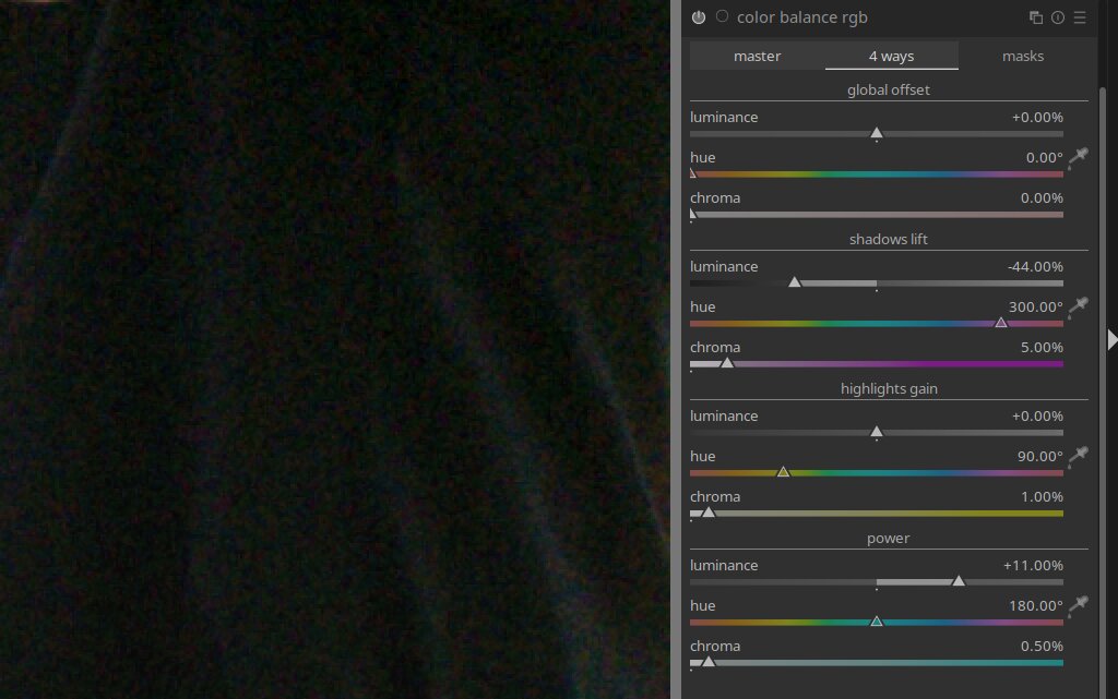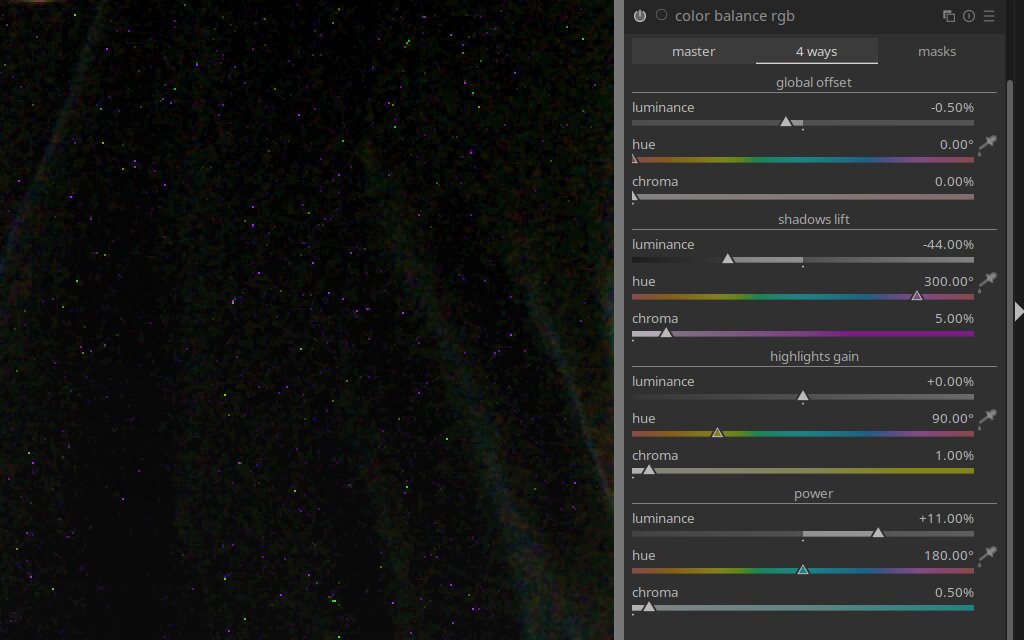 I do not speak enough rawtherapeean to know if they have a ColorBalanceRGB tool that introduces noise when using about a 1/20 of the range of the luminance slider …