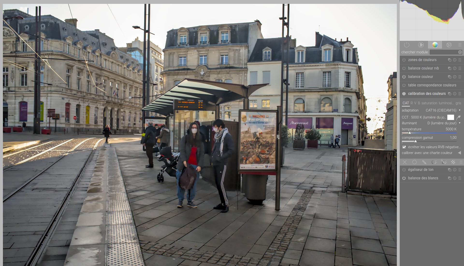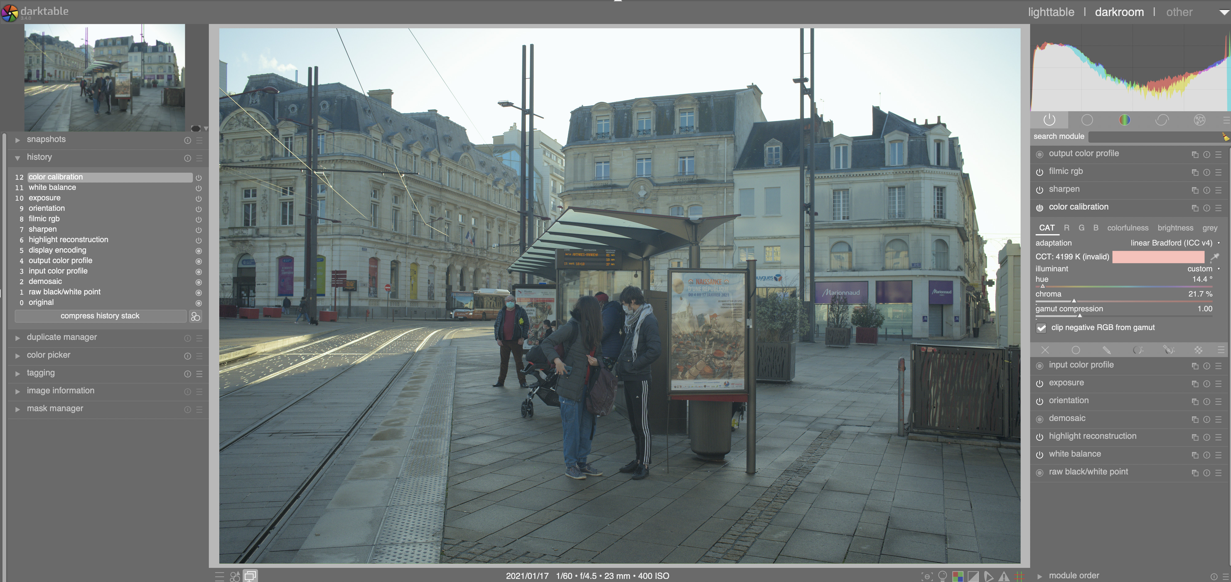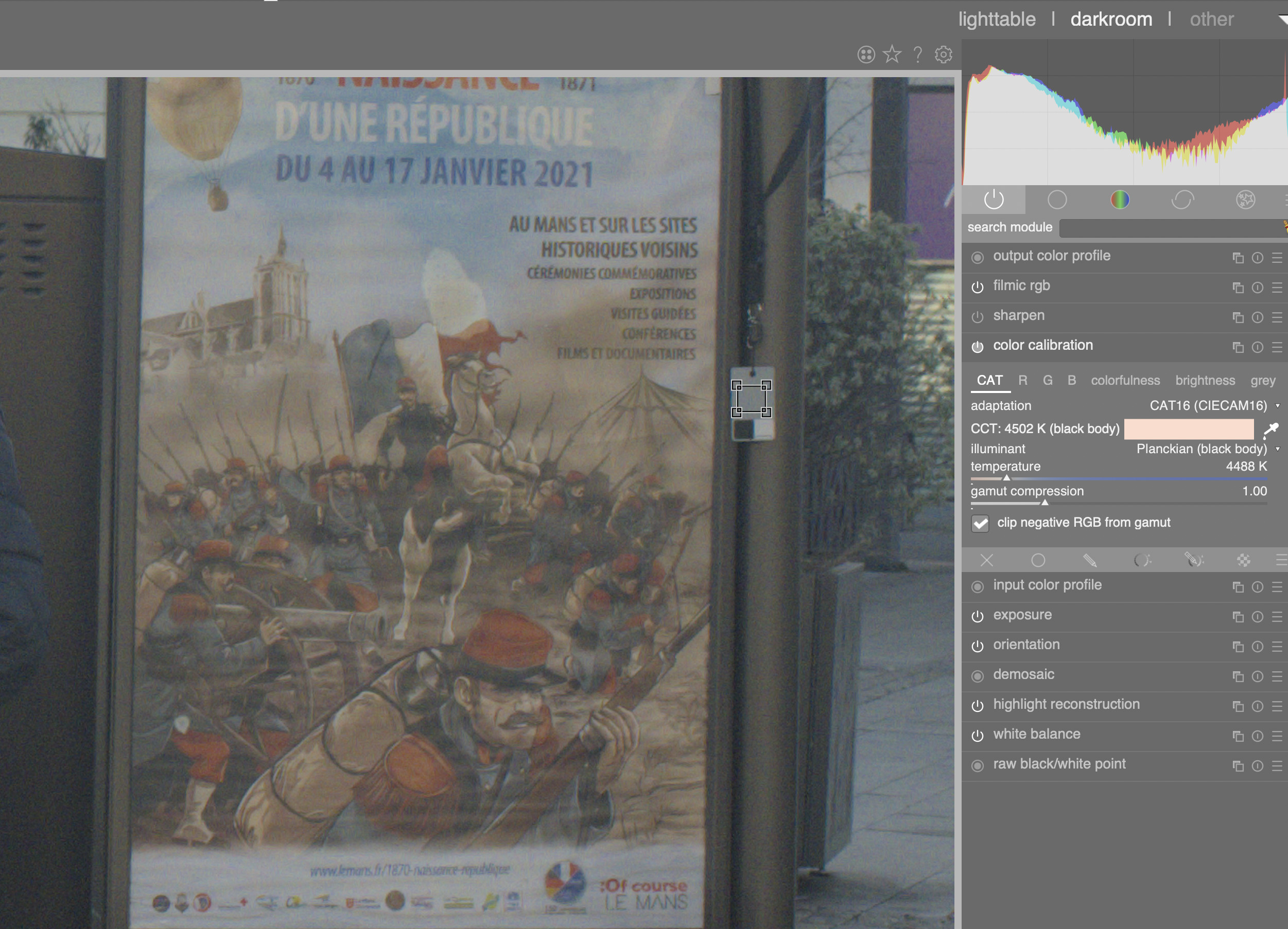 I have problems getting a good white balance with the new colour calibration module. I have a photo here using a neutral gray card (hanging on the post to the right). The colour is ok when colour calibration is off. When I switch it on, the picture goes very blue. If I pick the gray card, the picture takes a horrible greenish tinge. The only way I can get something acceptable is by using “detect from image surfaces”, but the grey card has no use then… Small detail, if I pick the surface of the grey card as a gray point and then read the area with a color picker, I get (54,48,47), not very grey.
