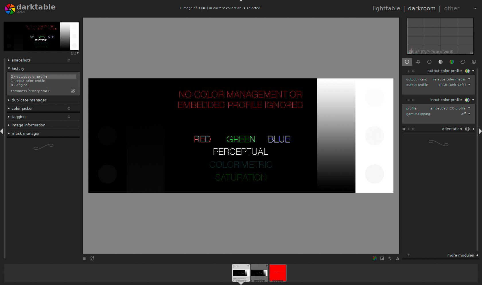 darktable colour management has been working fine for my raw files (dt 2.6 for Windows). Today I was doing some colour management tests on the basis of this DisplayCal page. To my surprise, darktable failed the “Test No. 2: Color Management with LUT-based profiles”. Here’s a screenshot: