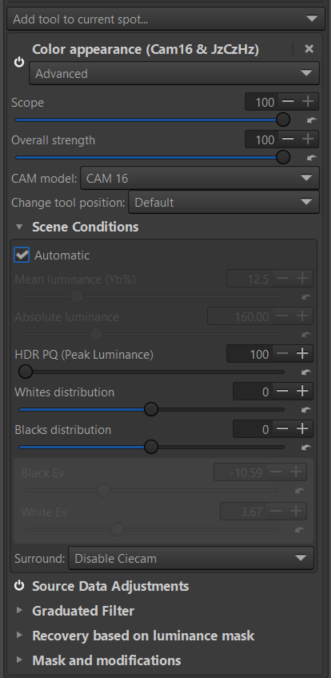 The Source Data Adjustments module is integrated into the Local Adjustments Ciecam module (Color Appearance). The Source Data Adjustment settings will therefore be affected by the ensuing colour appearance model (CAM).