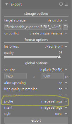 Then I’ve used my graphics card settings in ubuntu to set the brightness and “digital vibrance” (looks like saturation to me) down a little and I’ll then bring up the exposure (brightness/filmic/etc) in darktable per image to compensate for this, then check out the images on several devices. I was just hoping there was some sort of frig I could apply in darktable - for example maybe profile or intent on the export options - which could be set once and applied to all images.