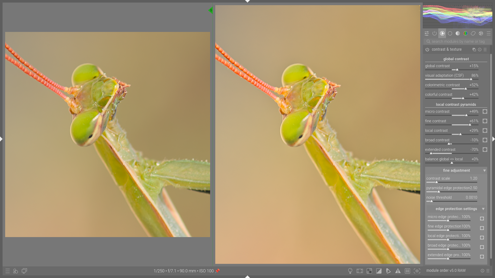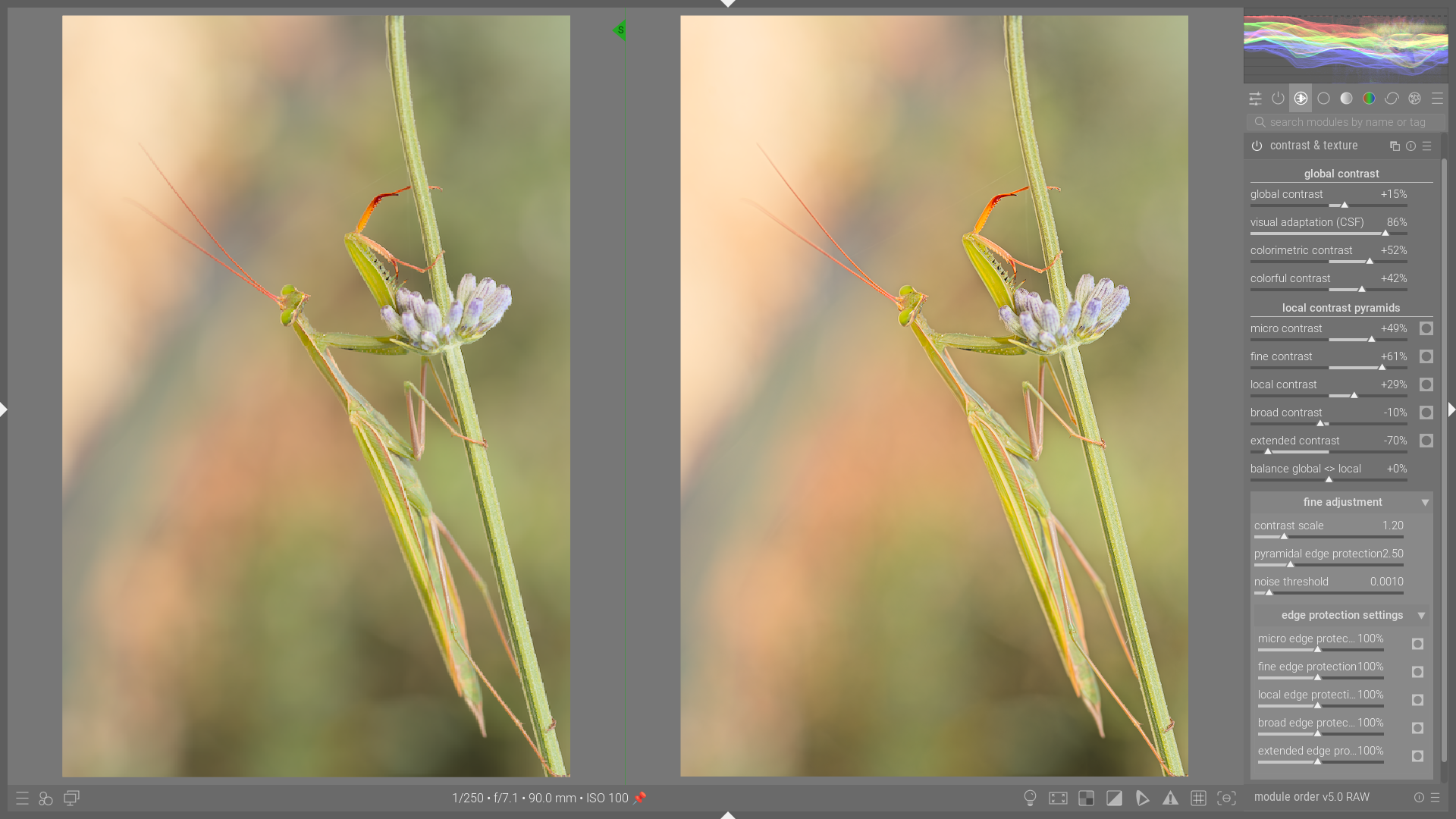 The purpose of this module is to simultaneously control all contrast levels in order to model, add texture, and give the image a sense of depth. The results obtained are exactly what I was looking for. As far as I’m concerned, this module does exactly what it’s supposed to do.