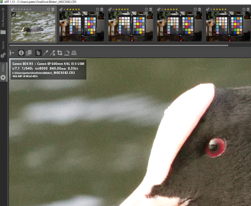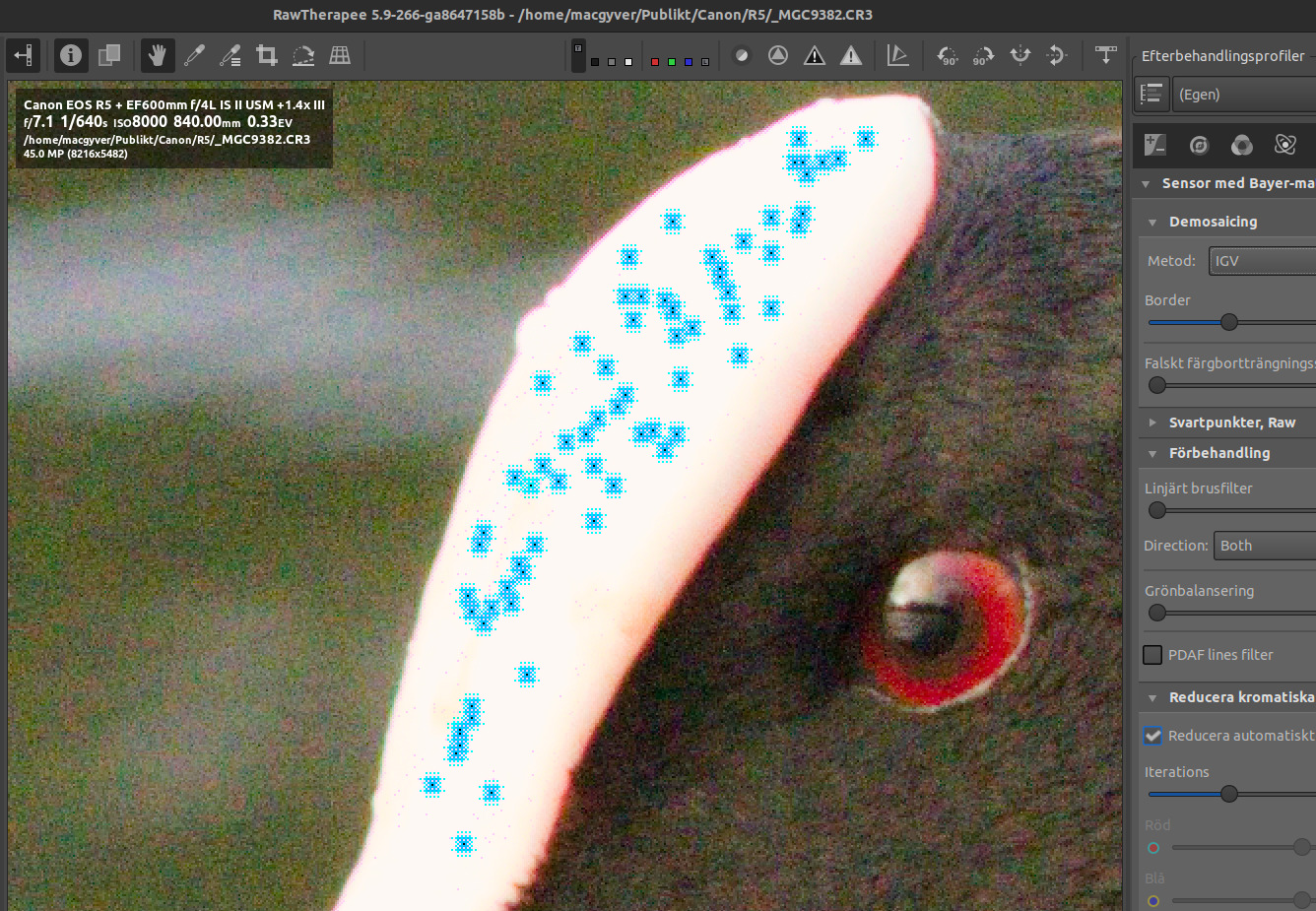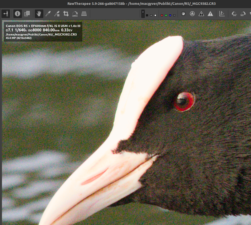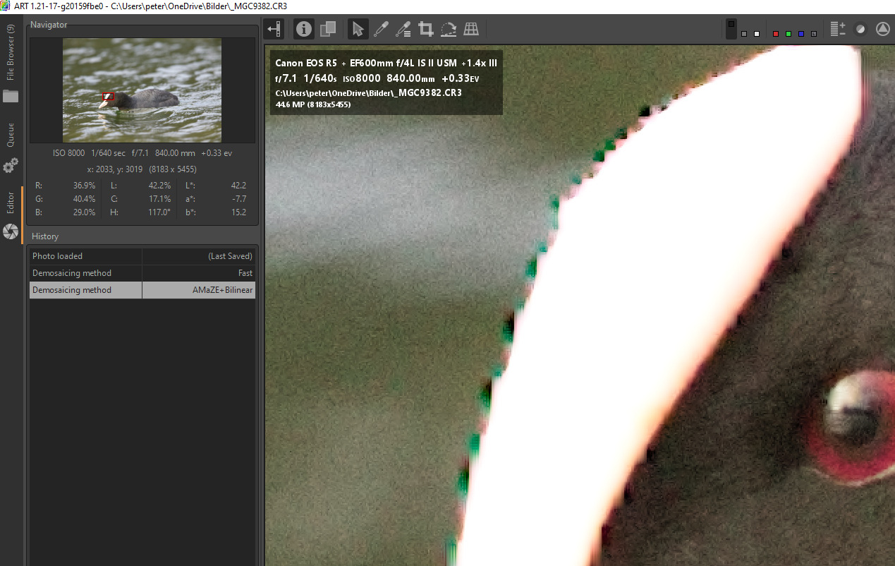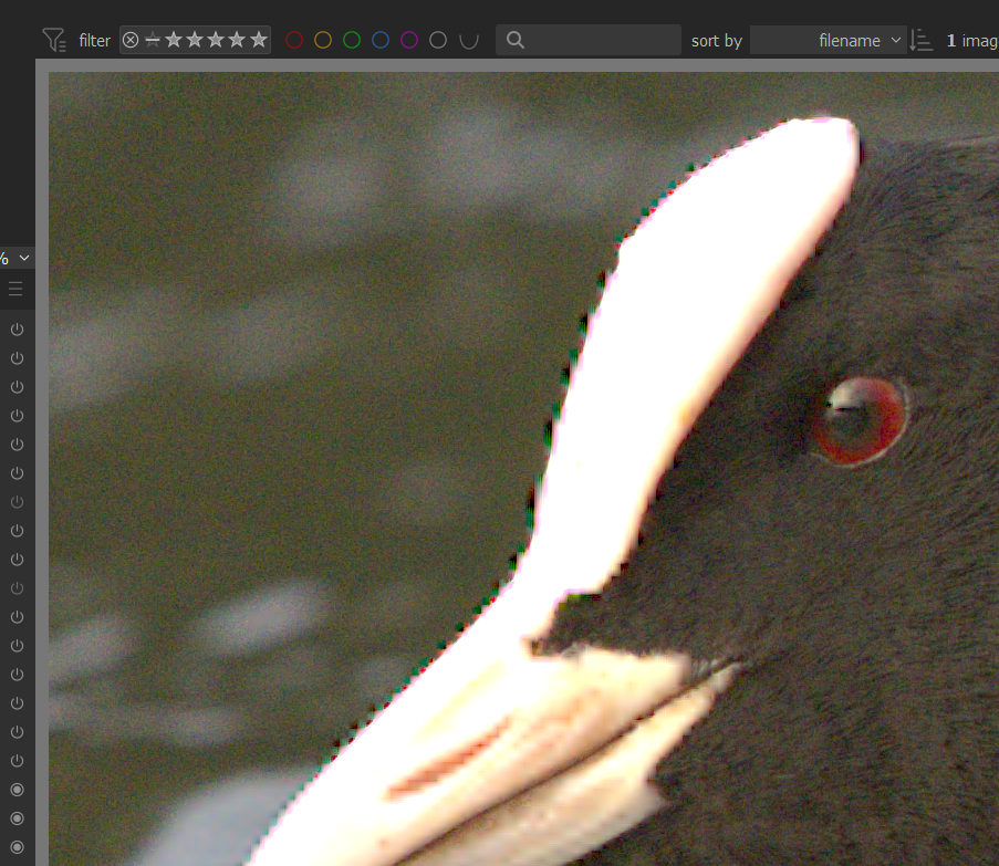 I think itâs the file. I get the same jagged effect when loading it into darktable 4.6, RawTherapee dev and ART 1.21.17 (other CR3s load cleanly). DPP shows it without the jaggies so it must be doing something to âfixâ it. The JPG thumbnail is in AdobeRGB color space, but that should have no bearing on it and I donât see anything strange.