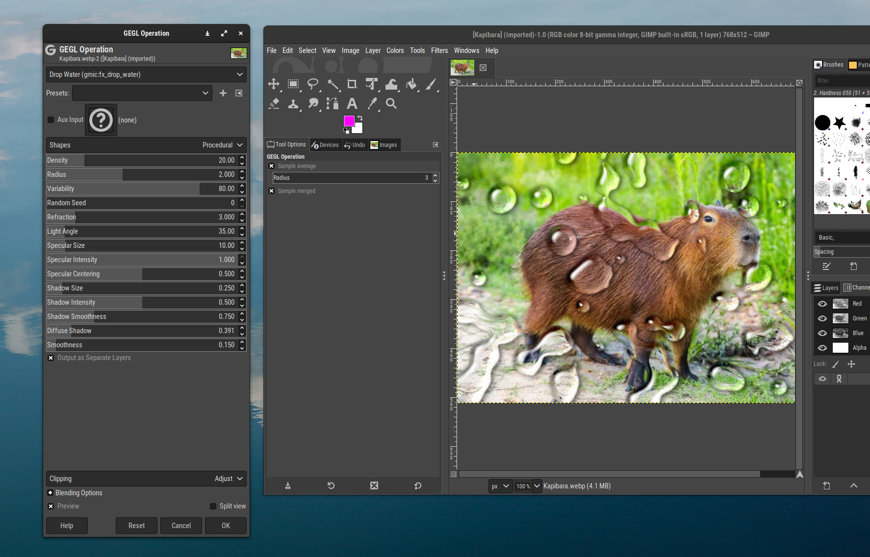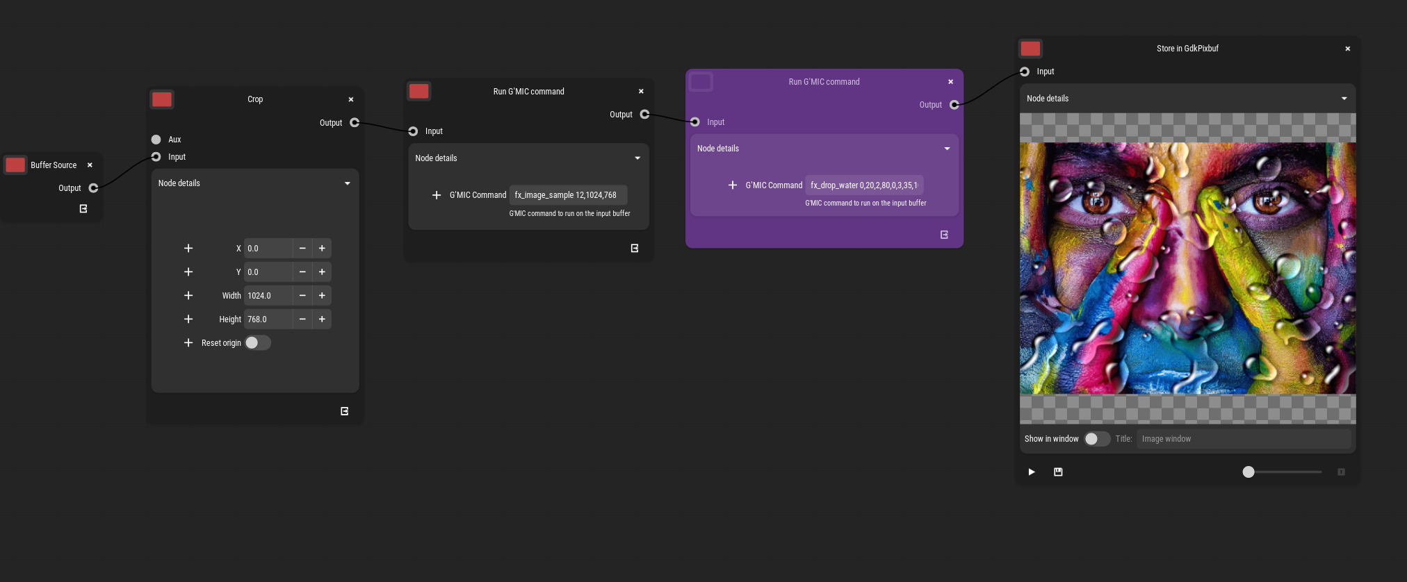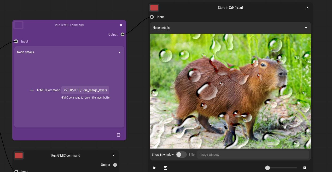 One of the hard-to-convert features of G’MIC is that a G’MIC filter can take any number of images M as input and generate any number of images N as output. This can typically be M=N for filters that work independently on each image, but it can be anything else (this is the case for the “Drop Water” filter, which generates additional layers for each image passed in as input, so N>M). But the fact is, there is absolutely no way, when parsing the filter definition, to know by advance how many layers a particular filter will output. It’s actually not a limitation it’s a feature Because some filters may generate additional layers or not, depending on the value of the parameters they are called with (e.g “Drop Water” has a parameter “Output As Separate Layers”.