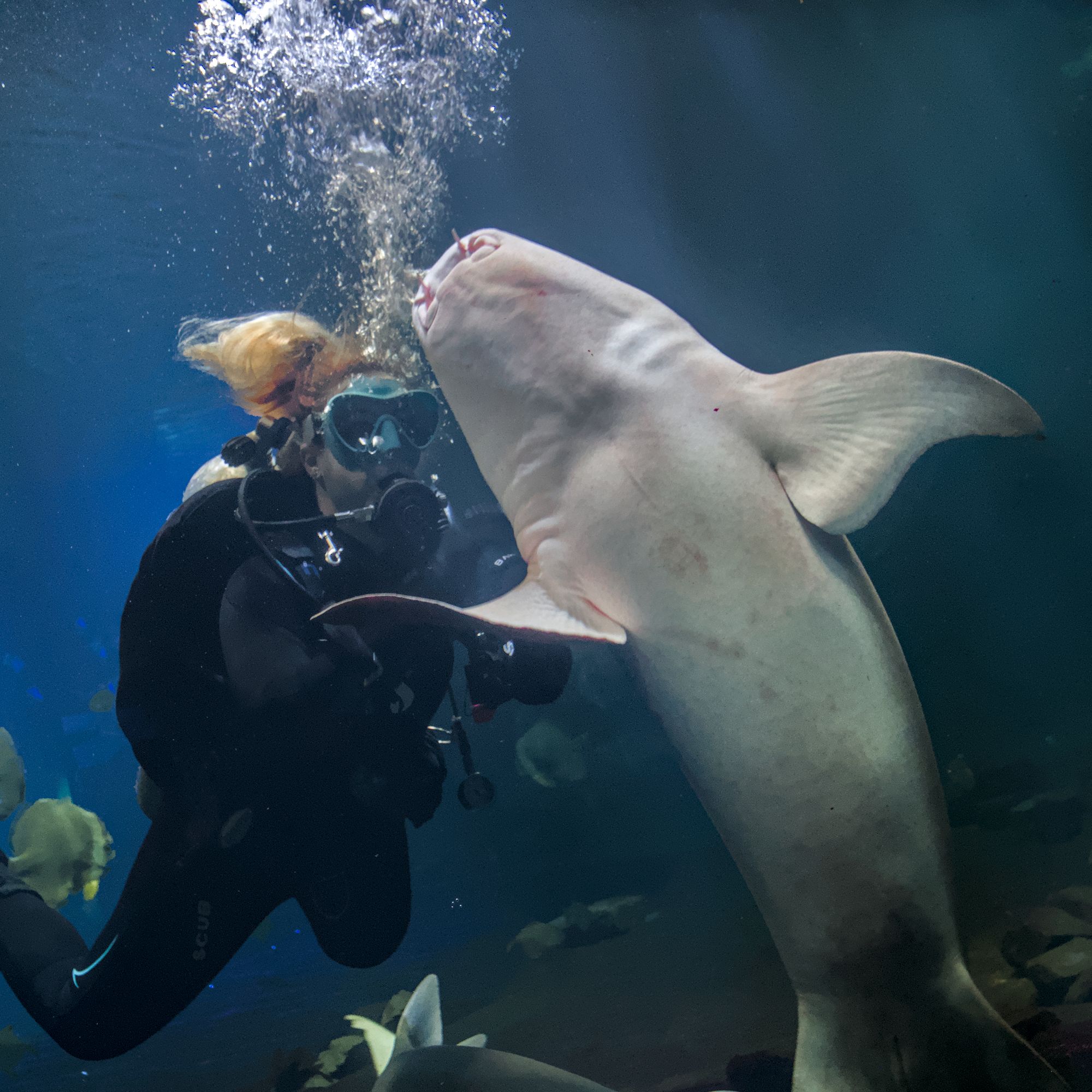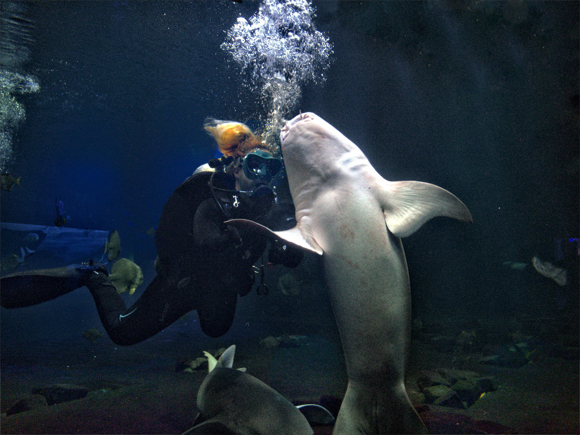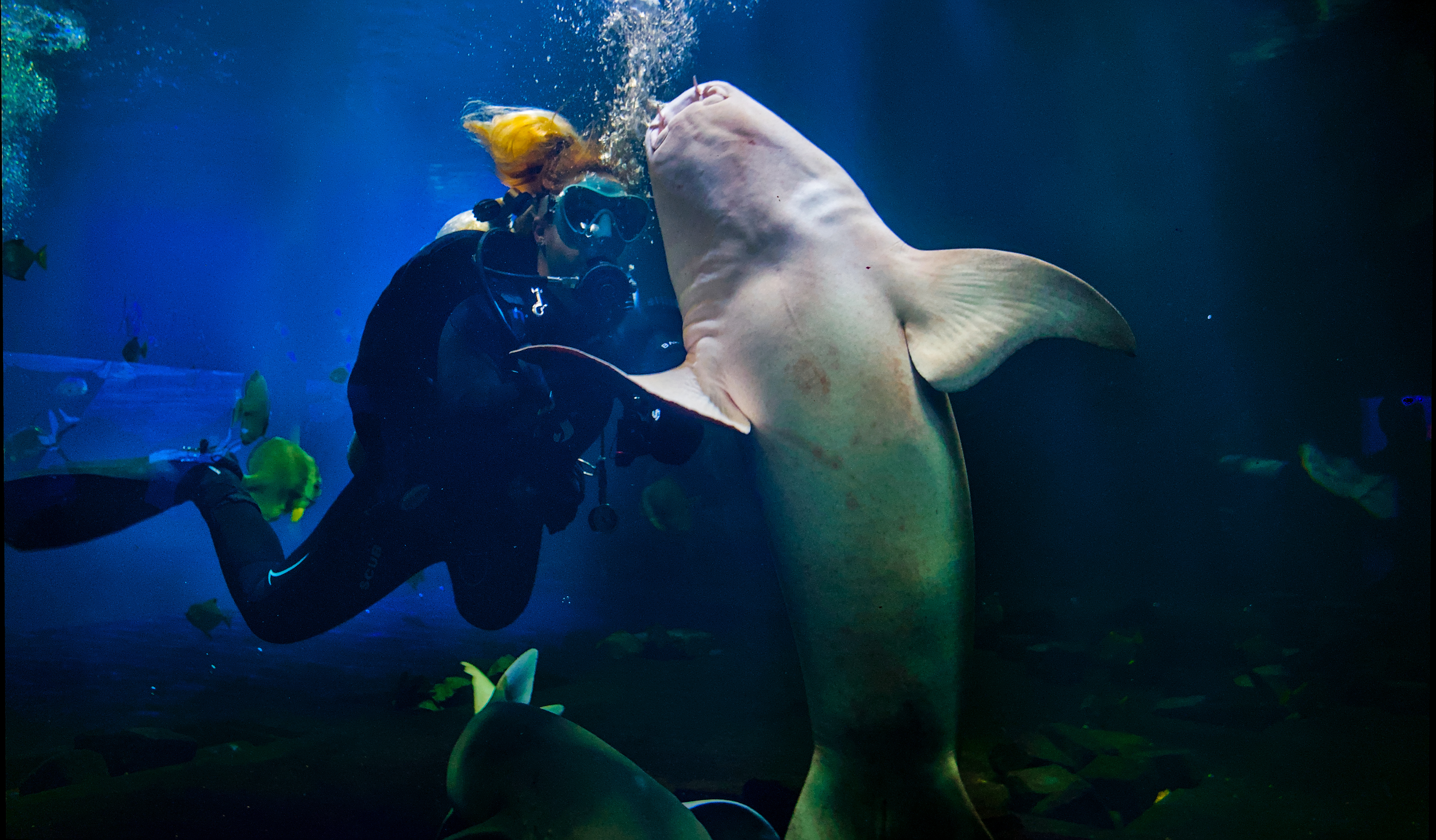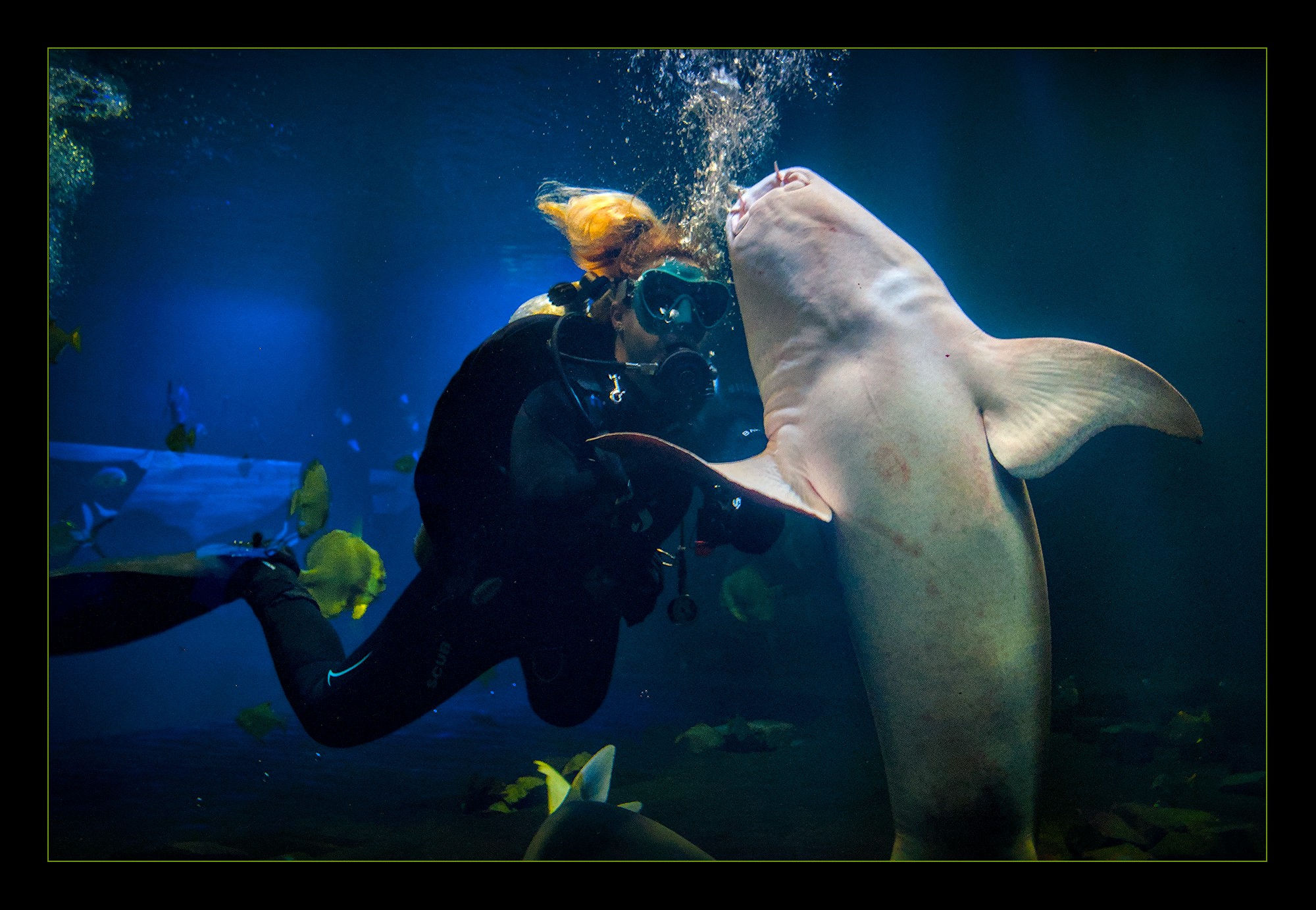 Shot at the shark aquarium in the Budapest Zoo. Sharks are handled by the staff during feeding so that they get used to humans touching them, it is easier to capture them for regular health checks.