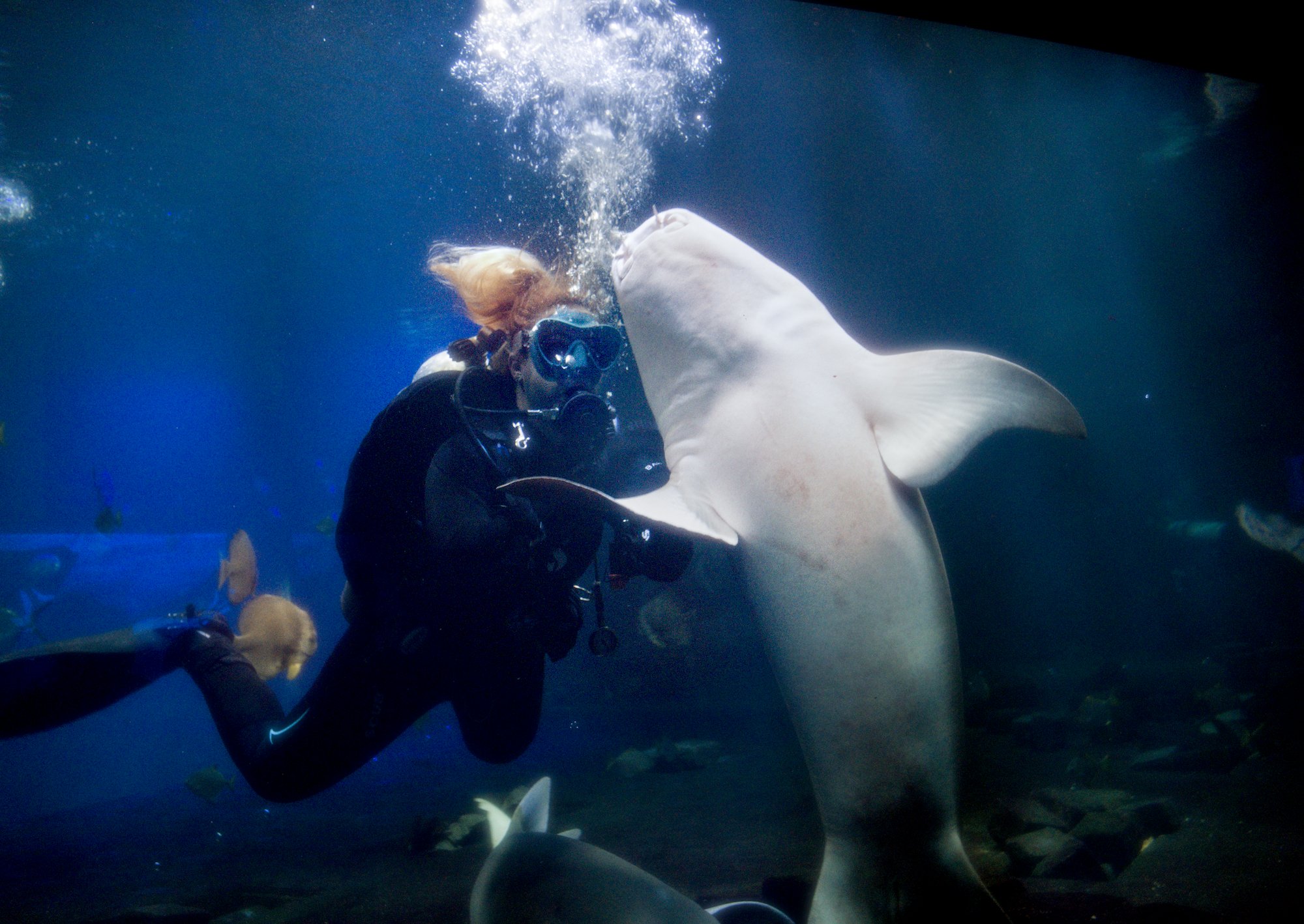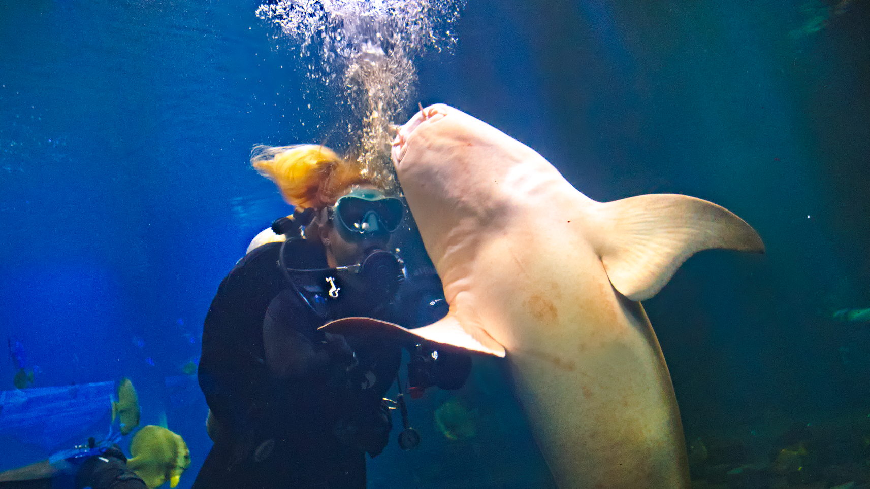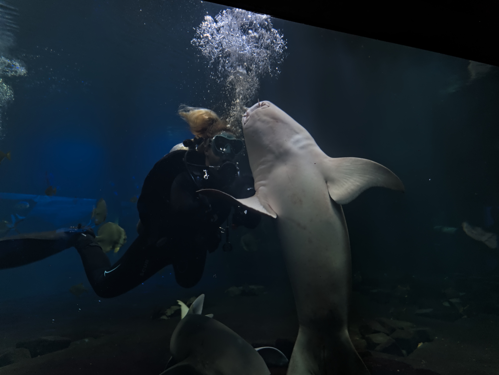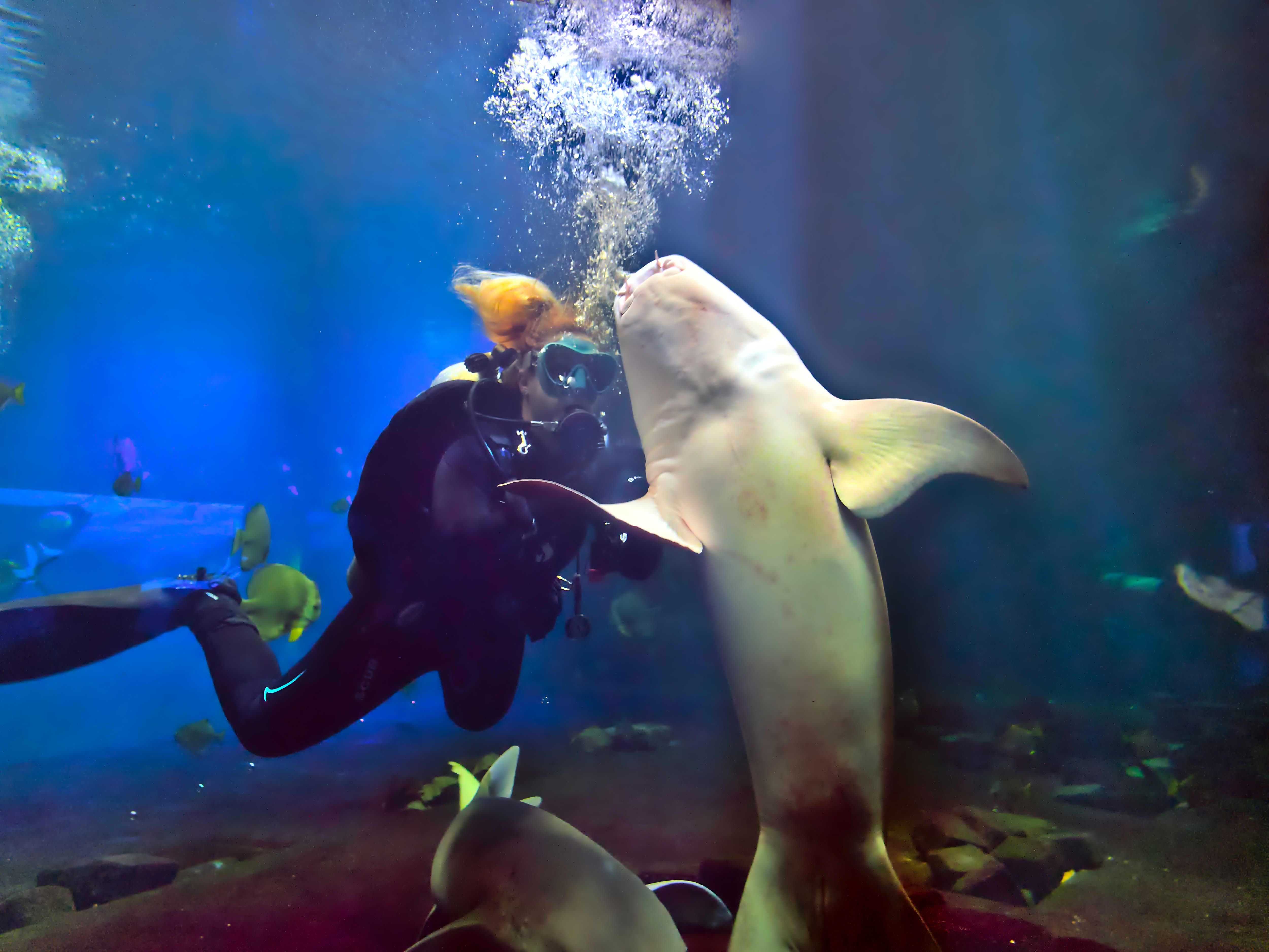 Shot at the shark aquarium in the Budapest Zoo. Sharks are handled by the staff during feeding so that they get used to humans touching them, it is easier to capture them for regular health checks.