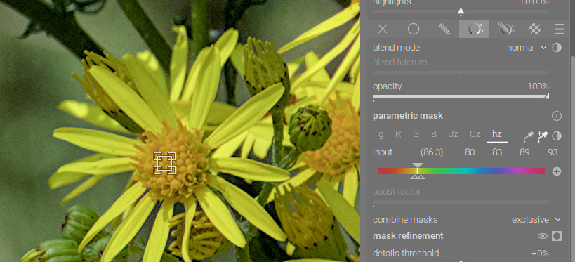 What was interesting for me was that the local contrast module activated by selecting the HDR Local Tone Mapping preset seem instrumental in putting details or variations of color into the yellow petals to bring the image closer to the supplied JPG.