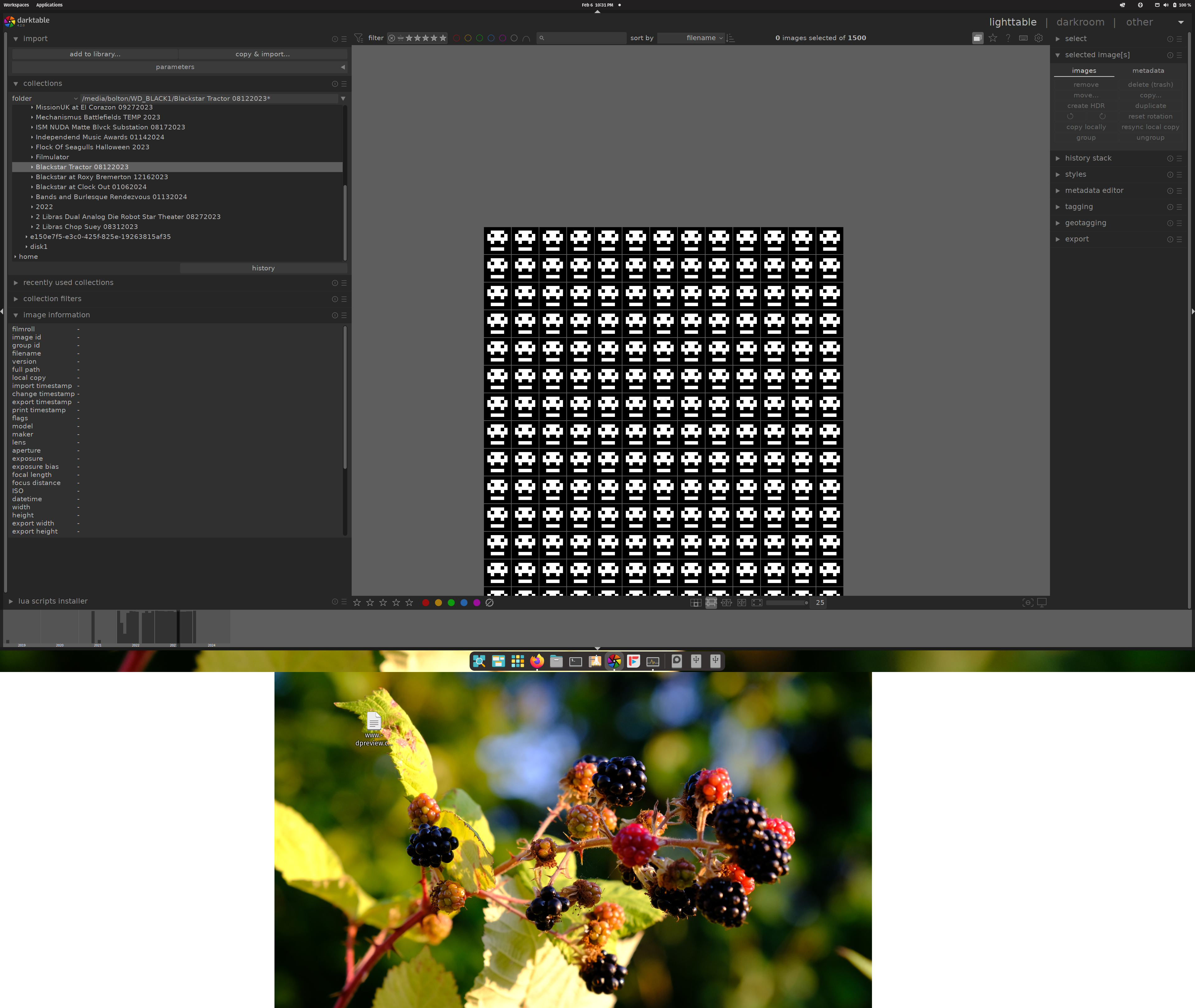 I really feel like Darktable should be a little more robust about its database. If I turn DT on and one of the external drives happens to not be on, it just goes ahead and loses everything imported from that drive til you reimport it all. All of it, all 156 events. Like, how come it can’t have a ‘refresh’ button that causes it to go out and probe the drive you just plugged back in and say ‘Oh, here are 156 events with Darktable import data for them, let’s put all that back so the user doesn’t have to.’ I feel like Lightroom users don’t have these issues, but since I don’t have Windows I can’t really find out.