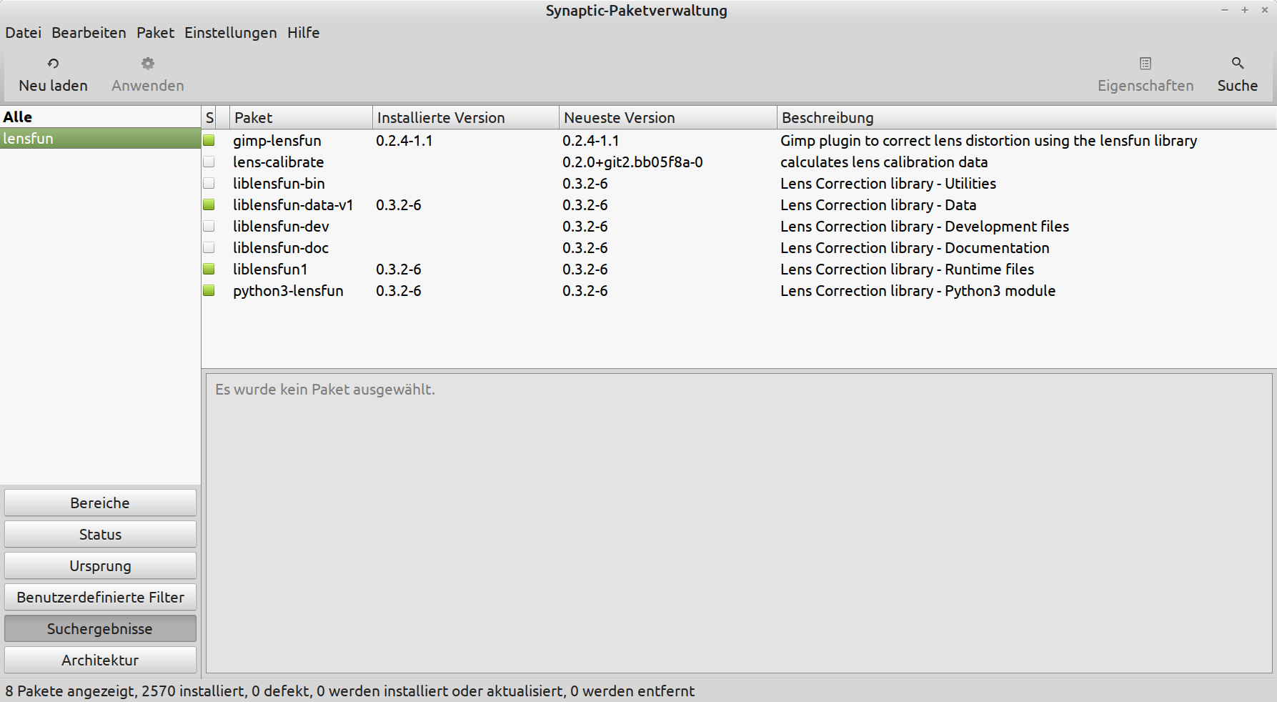 I added a screenshot from what is installed of lensfun from what I see at the Synaptic package manager. Maybe that helps?