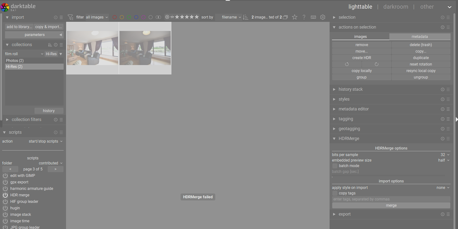 I installed the windows binaries for HDRMerge then installed it via the LUA script option. I started it and pointed it to the HDRMerge executable as instructed. Then I chose 2 JPG hi-res files that are almost aligned with different exposures. I also tested on the two NEF files for these (I use a Nikon camera). However, in both sets, the HDRMerge failed.