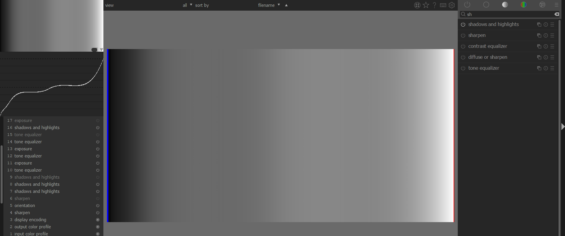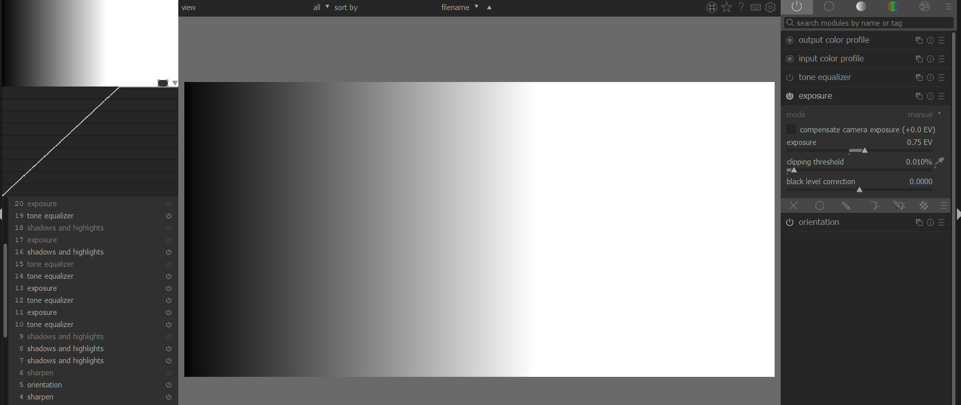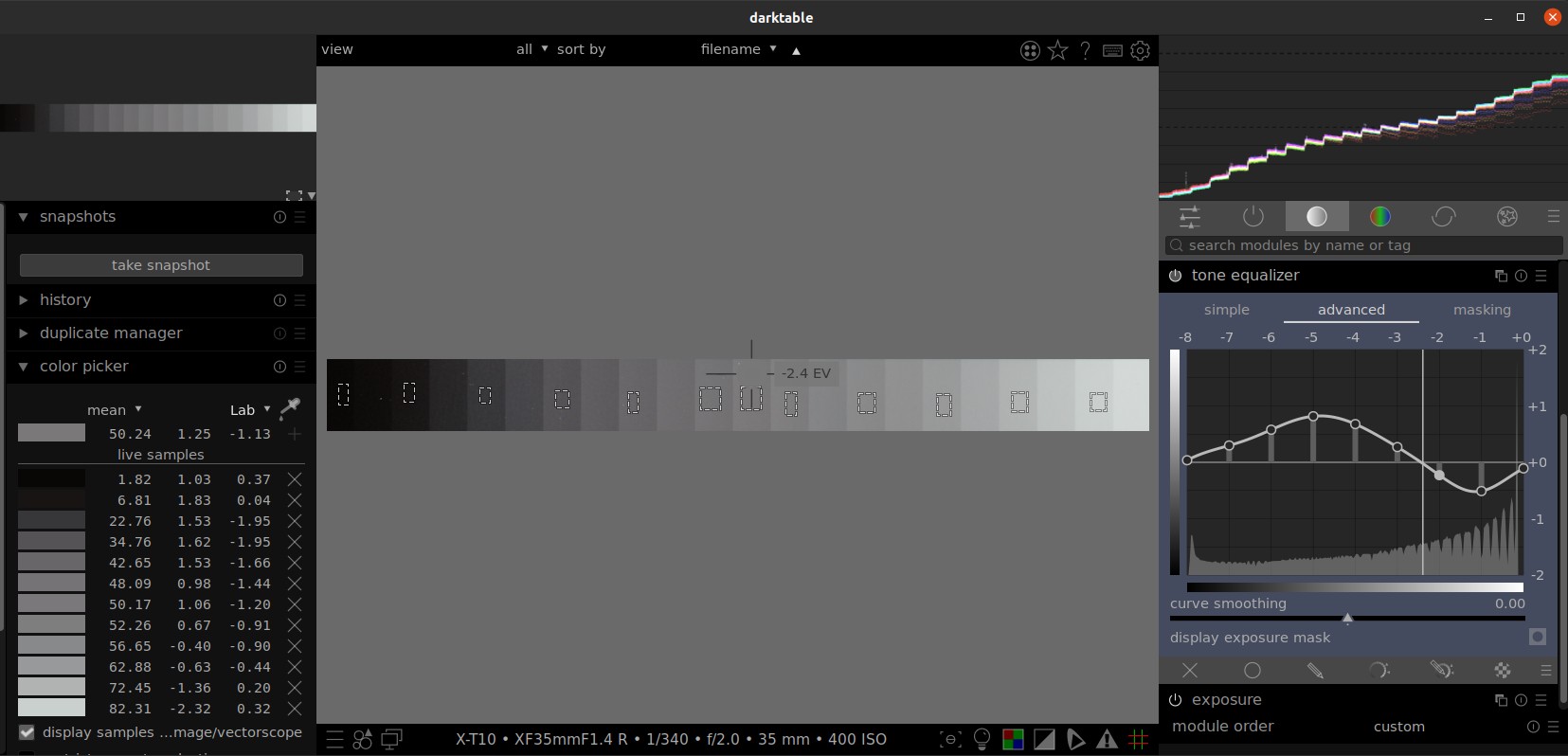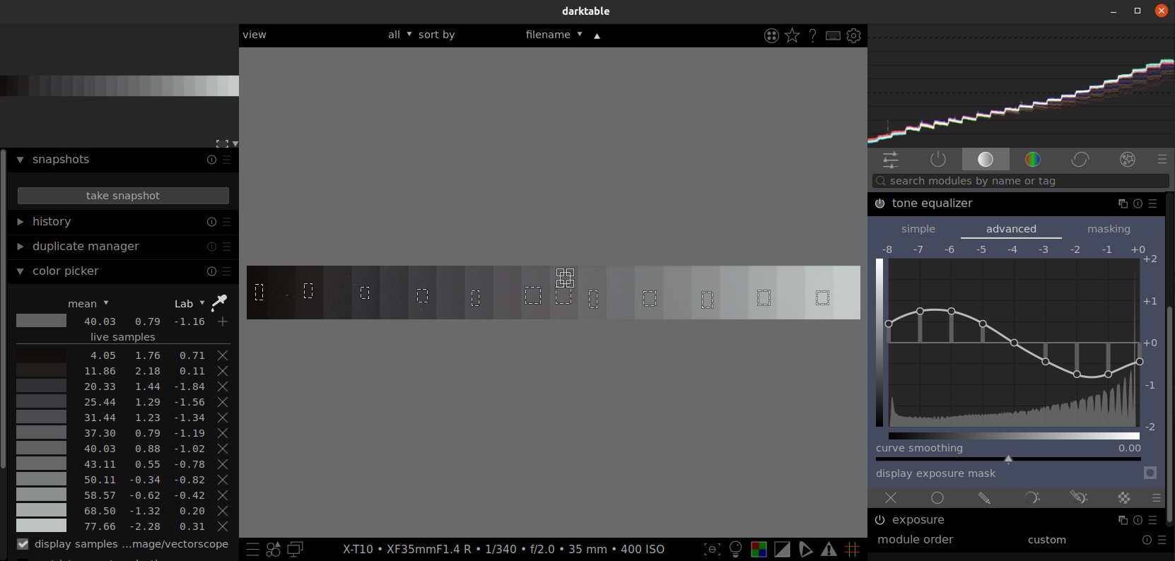 I thought it would be difficult to get a gray gradient in RAW to test the tone equalizer under real conditions. But there are different shades of gray in a color target. This can be used to test the behavior of the modules.