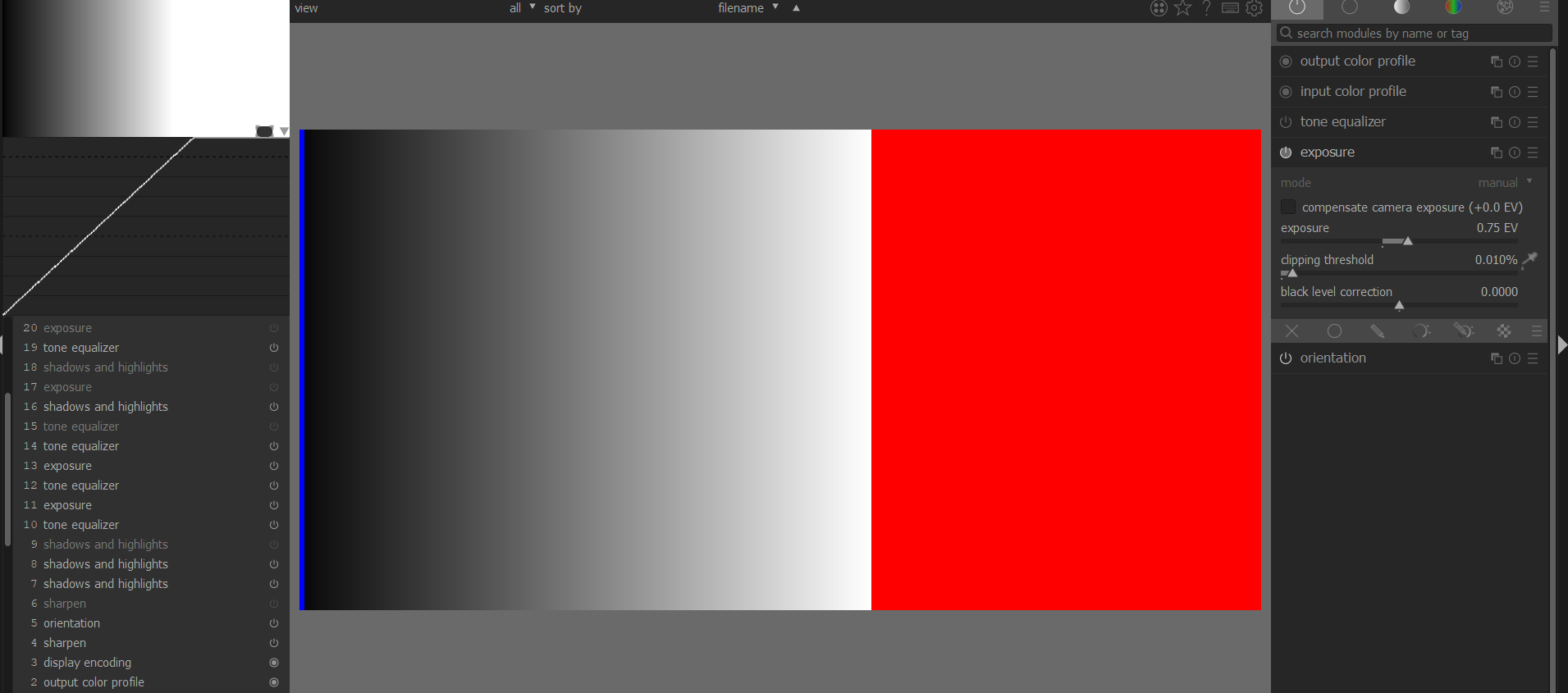 Any idea for your experiments: you can easily create values > 1 (such as those you’d have with the scene-referred workflow using a raw file) by adding exposure to the grey image having values between 0…1. With +2 EV, you’ll have values up to 4.