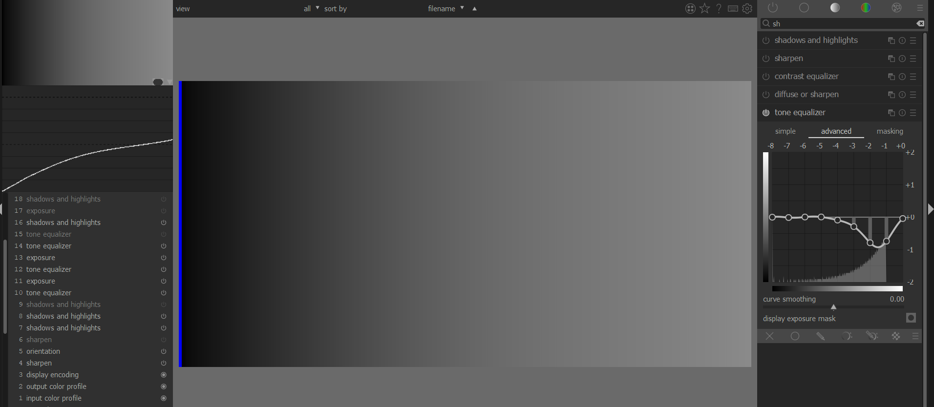 and now the tone equalizer. Preset “compress shadows/highlights: medium” and optimizing the mask so that the histogram fits.