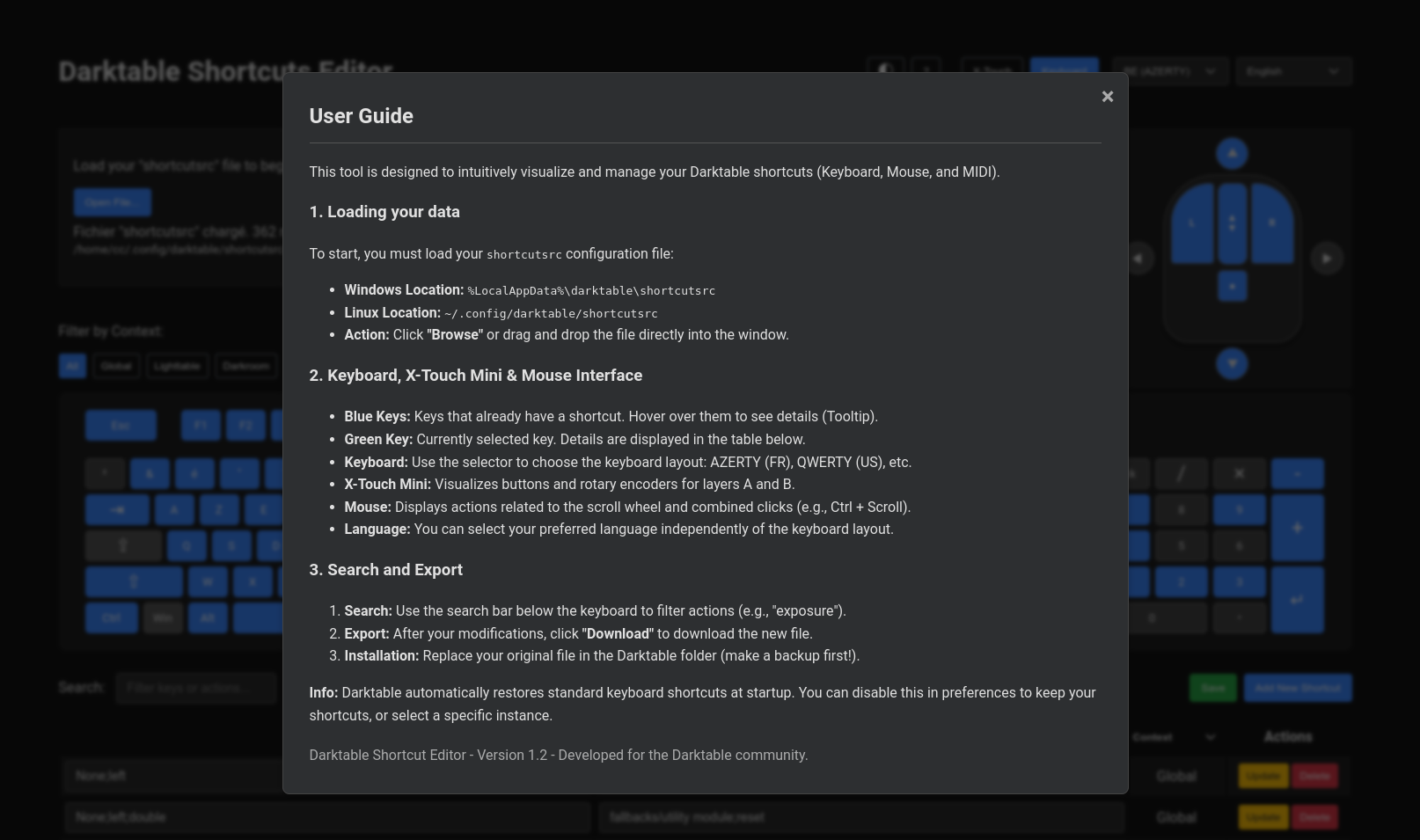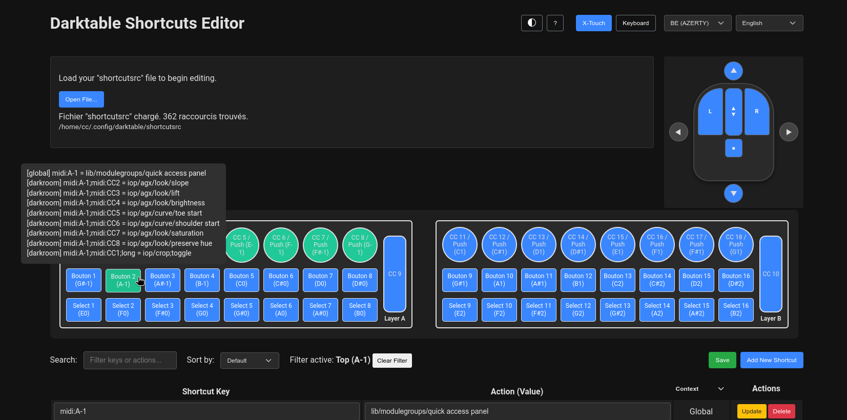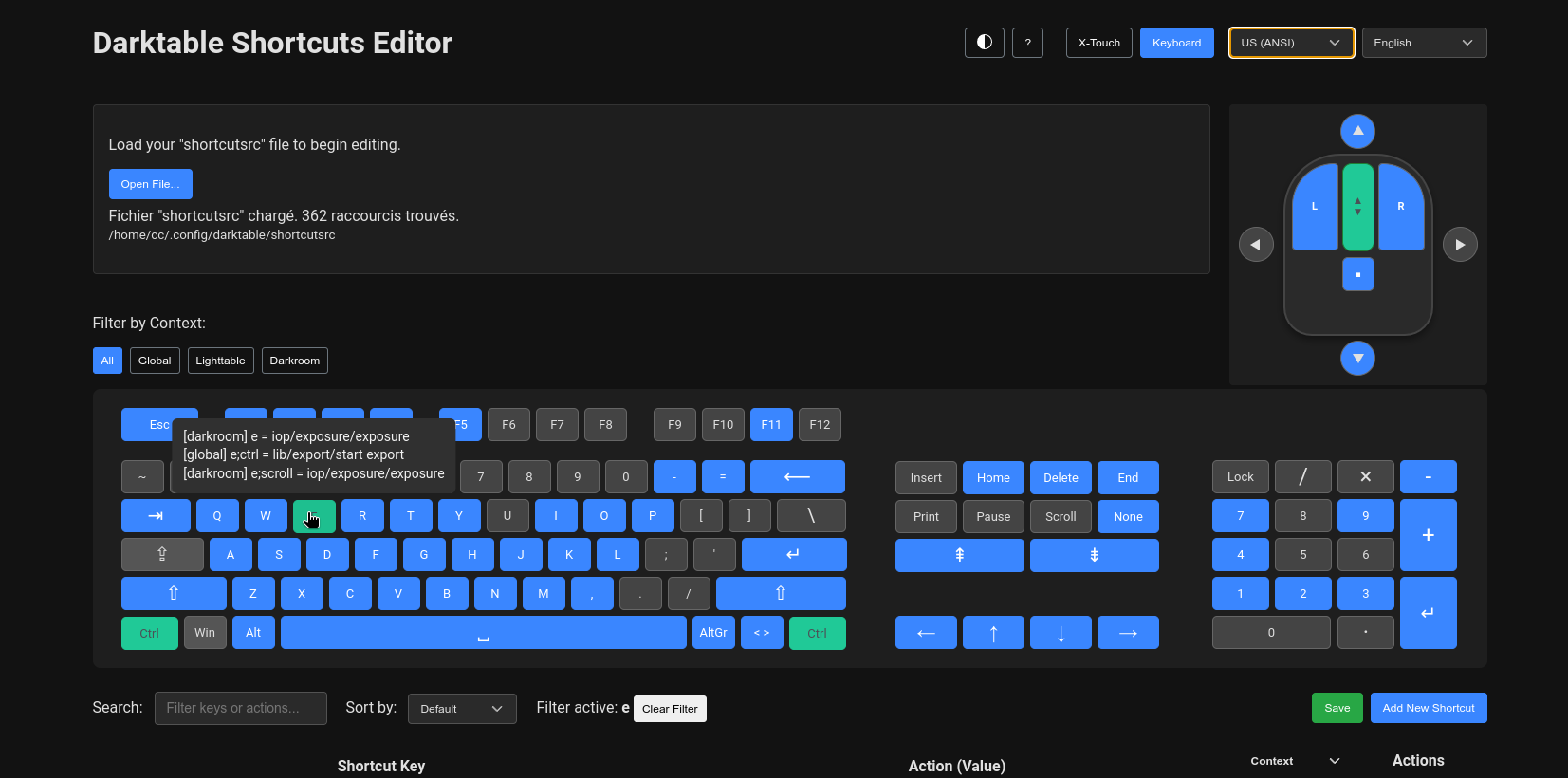 Here is a new version of the darktable editor. When I started using it to finalise my keyboard shortcuts, I noticed several bugs and inconsistencies with the AZERTY keyboard. I realised that it is the native keys that are important. For example, on a French keyboard, the ‘1’ key is actually recognised by darktable shortcuts as ‘&’. So I rewrote the entire keyboard section so that I could change the layout without changing the design. I based it on an ANSI keyboard. This allowed me to add the main layouts of Latin alphabet keyboards.