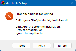 I aborted the installation and tried to run DT, which errored. I then tried to reinstall ga090a7aa3 and got the same libLerc.dll error. After renaming the darktable installation folder g5cca9d64b installed normally.