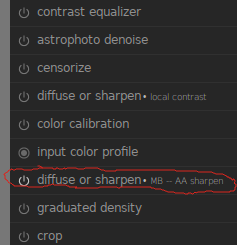 I agree there may not be a benefit to having a “diffuse and sharpen” module before “input color profile”, but I was playing with this idea since it’s mentioned in the manual. I just wanted to see if I could have that module automatically applied in a non-default position for all new photos.