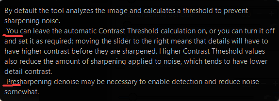 I tried the latest capture denoise build and things work fine in my limited testing with one only thing: tooltips has slight alignment issues. The beginning of a paragraph should not have a space. Below is the tooltip of Contrast Threshold as an example, seems like the same issue is also in the tooltips of Presharpening denoise, Radii and Postsharpening denoise.