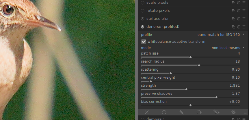 When I first tried it, it didn’t work. Then I went to wavelets mode and switched from Y0U0V0 to rgb and got a change. Then I switched back to non-local means and didn’t see a change so I went to the blending modes and got it working. I might have turned on global (the circle), but after I turned it off it was still working. I’ll see if I can figure out a way to make it happen. It does work fine on raw images.