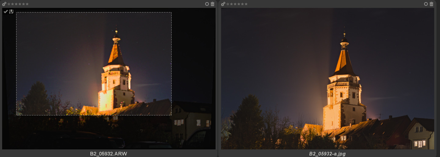 enclosed a screen shot of a picture where you can see that the visible crop frame in the file browser (on the left) is different to the crop made in the developed jpg (on the right).