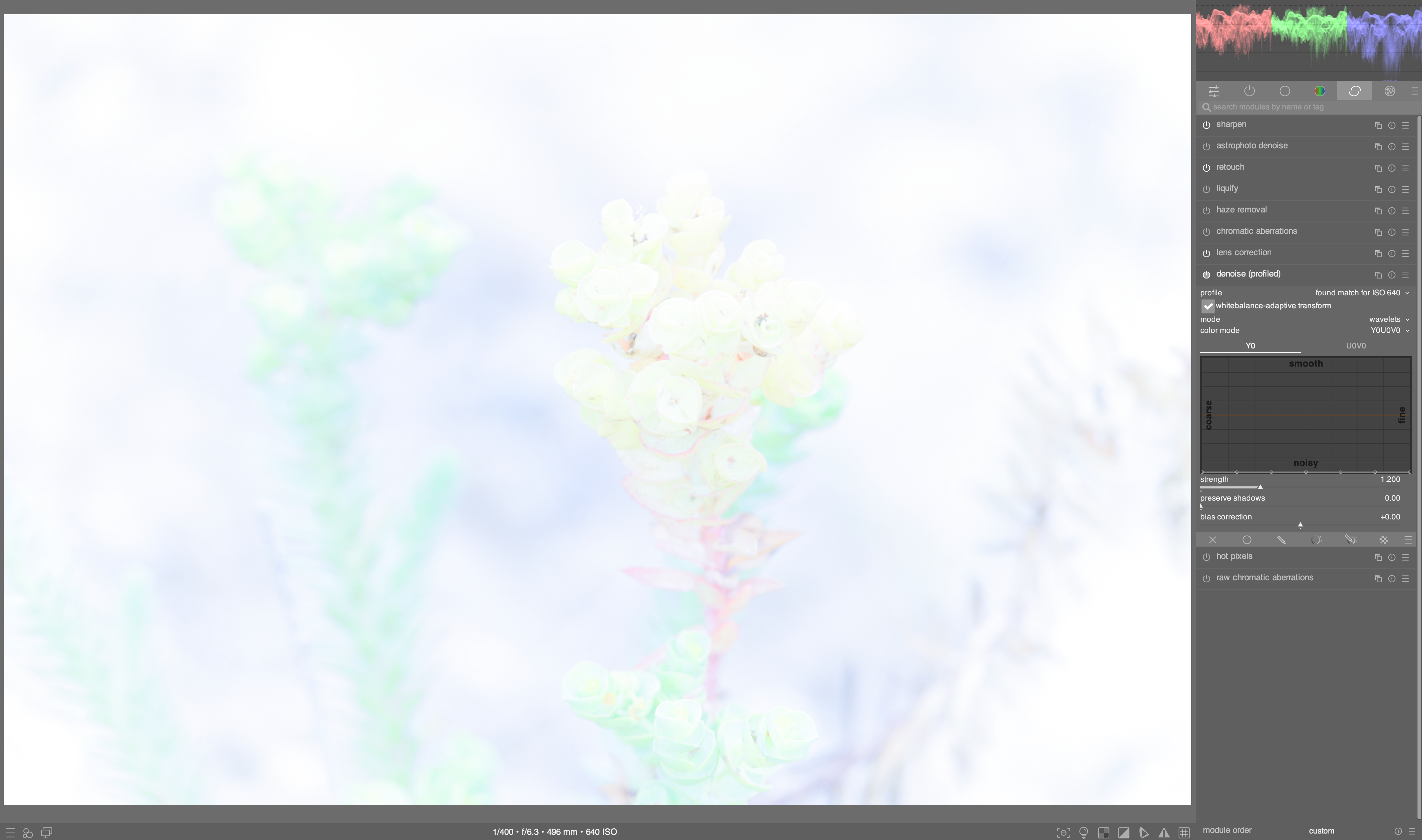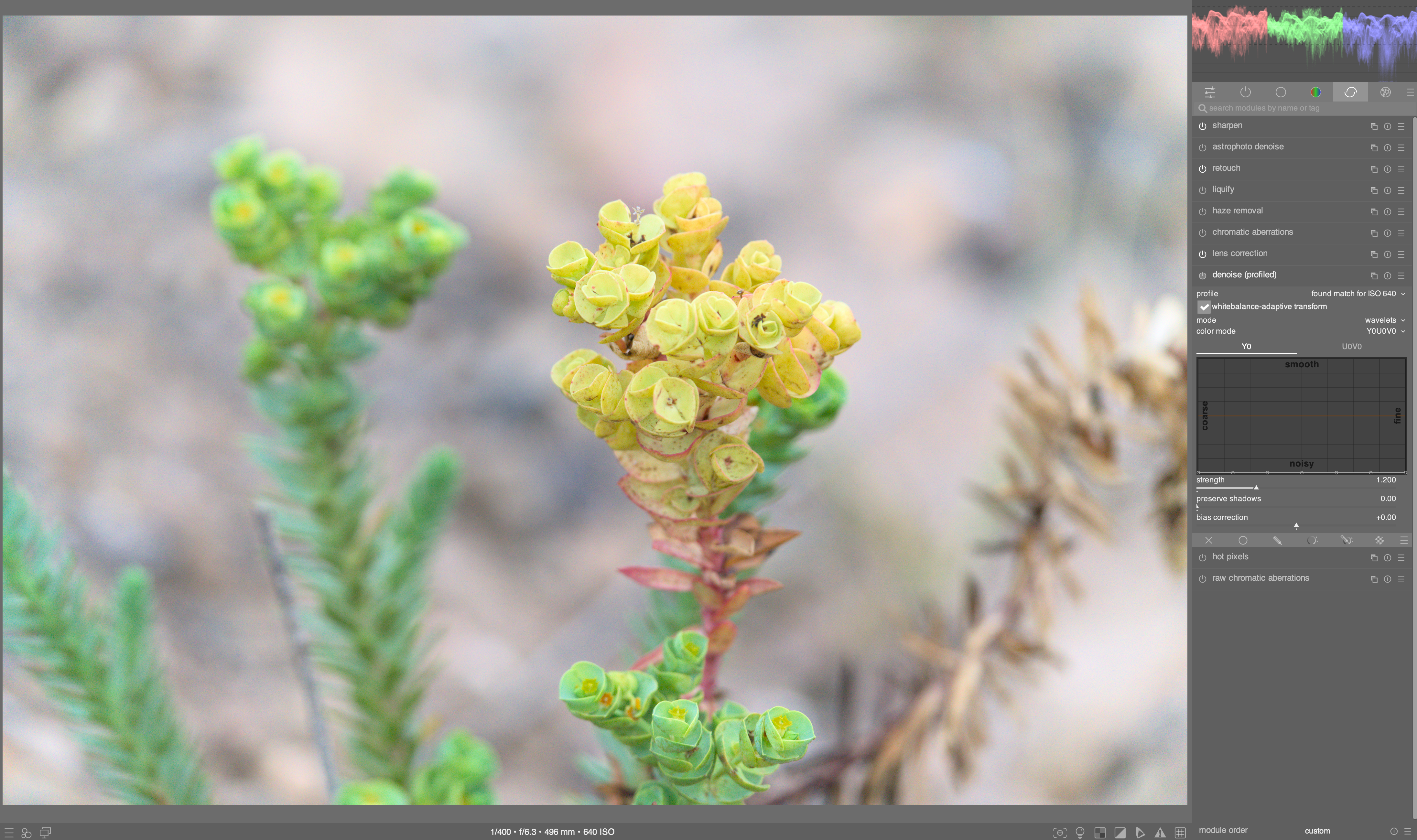 I thought I would be able to get similar effects to the old modules, with a bit more ‘scene-referred purity’. The default setting for the old Local Contrast module, is clearly evident and in many cases beneficial for my photos, and has become something of a go-to for my workflow. But the ‘D or S’ presets, both the single-iteration ‘Fast Local Contrast’ and the 10-iteration ‘Add Local Contrast’ presets, are so subtle that I would be challenged to tell if they were on or off, without a quick A/B/A comparison, and even then it is an eye-squinter. Same for Sharpen Demosaicing preset.