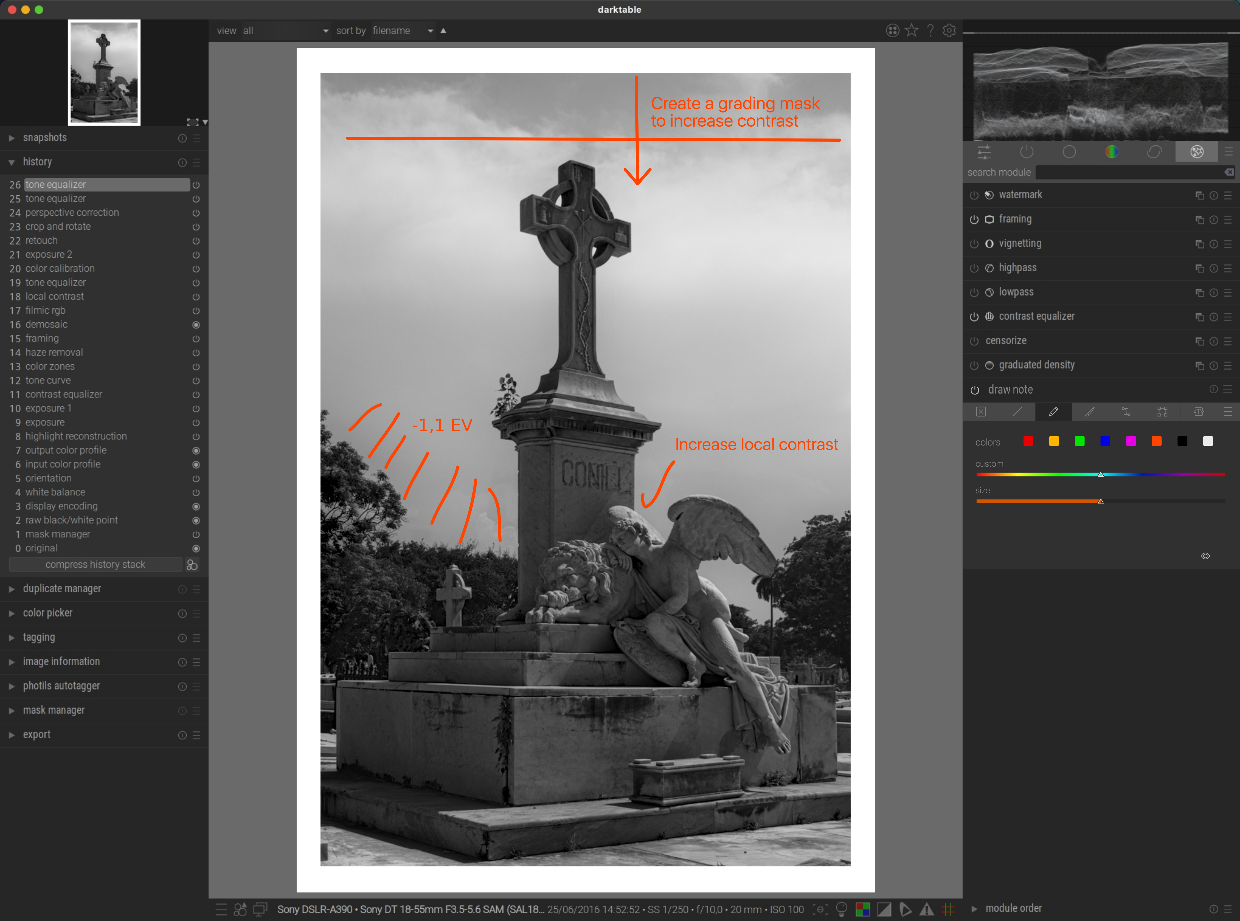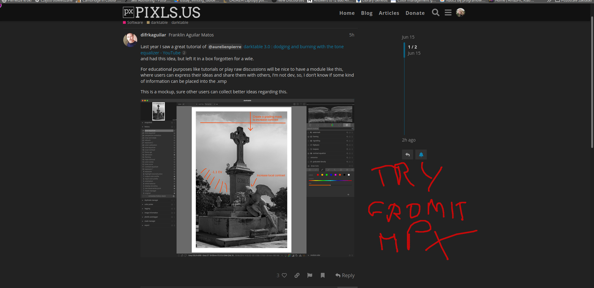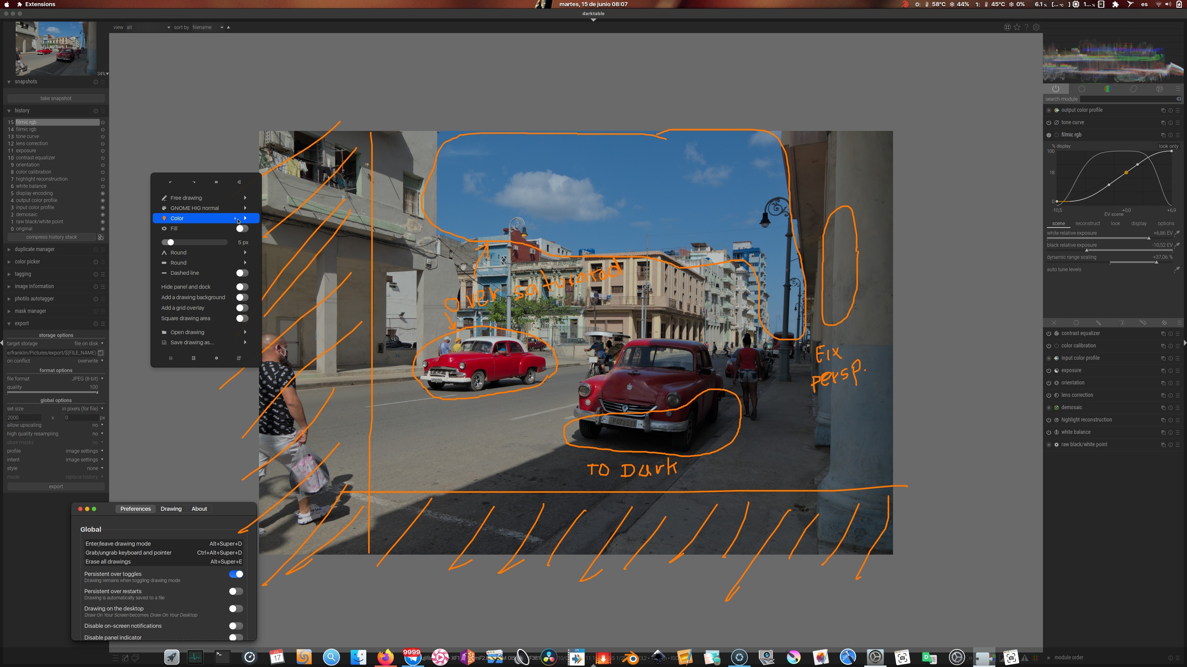 Thanks for the Gromit-MPX tip, anyway I use gnome with an extrension named “Draw on your screen” abakkk / DrawOnYourScreen · GitLab and it’s great to do the sketches over images. I was thinking on usability for darktable users of others platforms like Windows and Mac and the ability to share files between them with those annotations.
