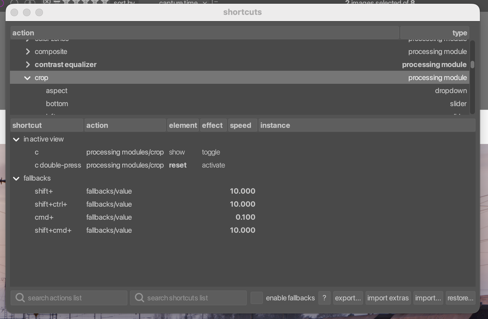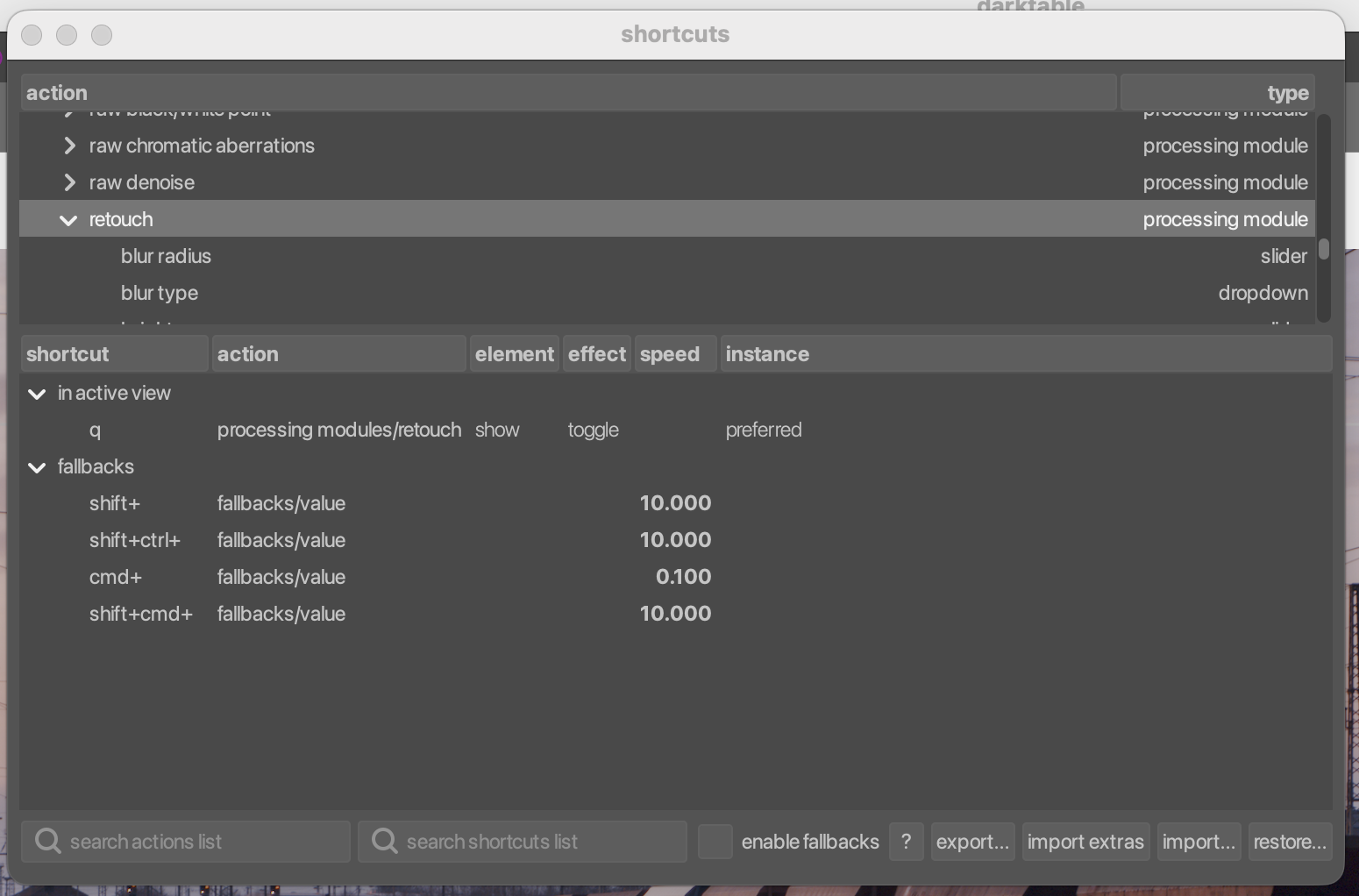 Here you can add keyboard shortcuts. Double-click the mix slider in the action list to add a shortcut for it. Everything greys out, and darktable waits for your shortcut. Whatever you do now, will become the new shortcut. For example, if you just hit x, it will create a new shortcut for hitting x. If you double-press x, it will create a new shortcut for double-pressing x. In my case, I create, one by one, a shortcut for x, double-press x, hold x while moving the mouse vertically, and holding x and shift while moving the mouse vertically. You can see this in the table below the action list in the screenshot above.