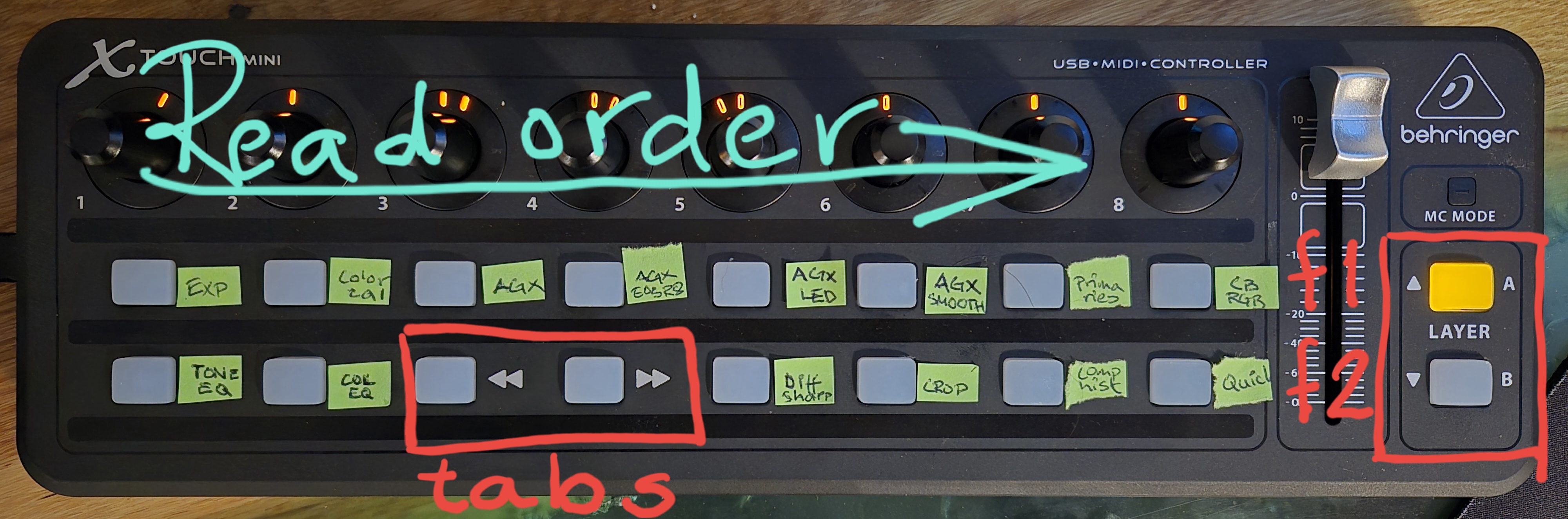I am now running nine modules, compress history and quick panel toggle. All modules with tabs are supported and all sliders in AgX for example are covered. There are also three AgX presets layed out. All buttons in layer B is unused so plenty of space to add more stuff to it.