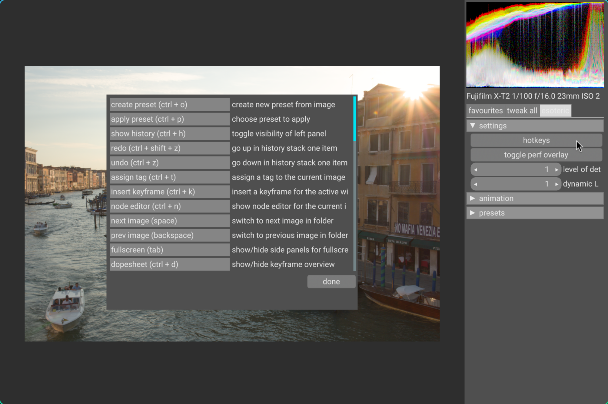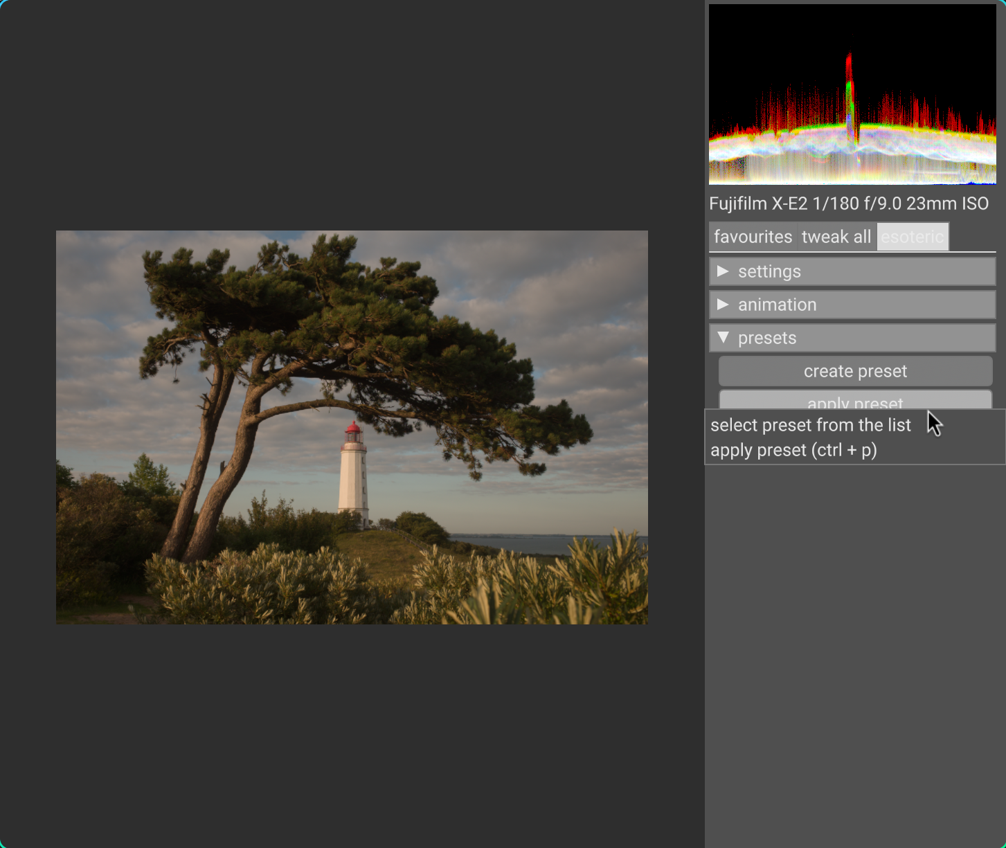 also, any other display transforms (film curve) should be removed. the mentioned preset takes care of all this. if you use a certain preset often, it’s possible to bind it to a button in the favourites tab by adding: