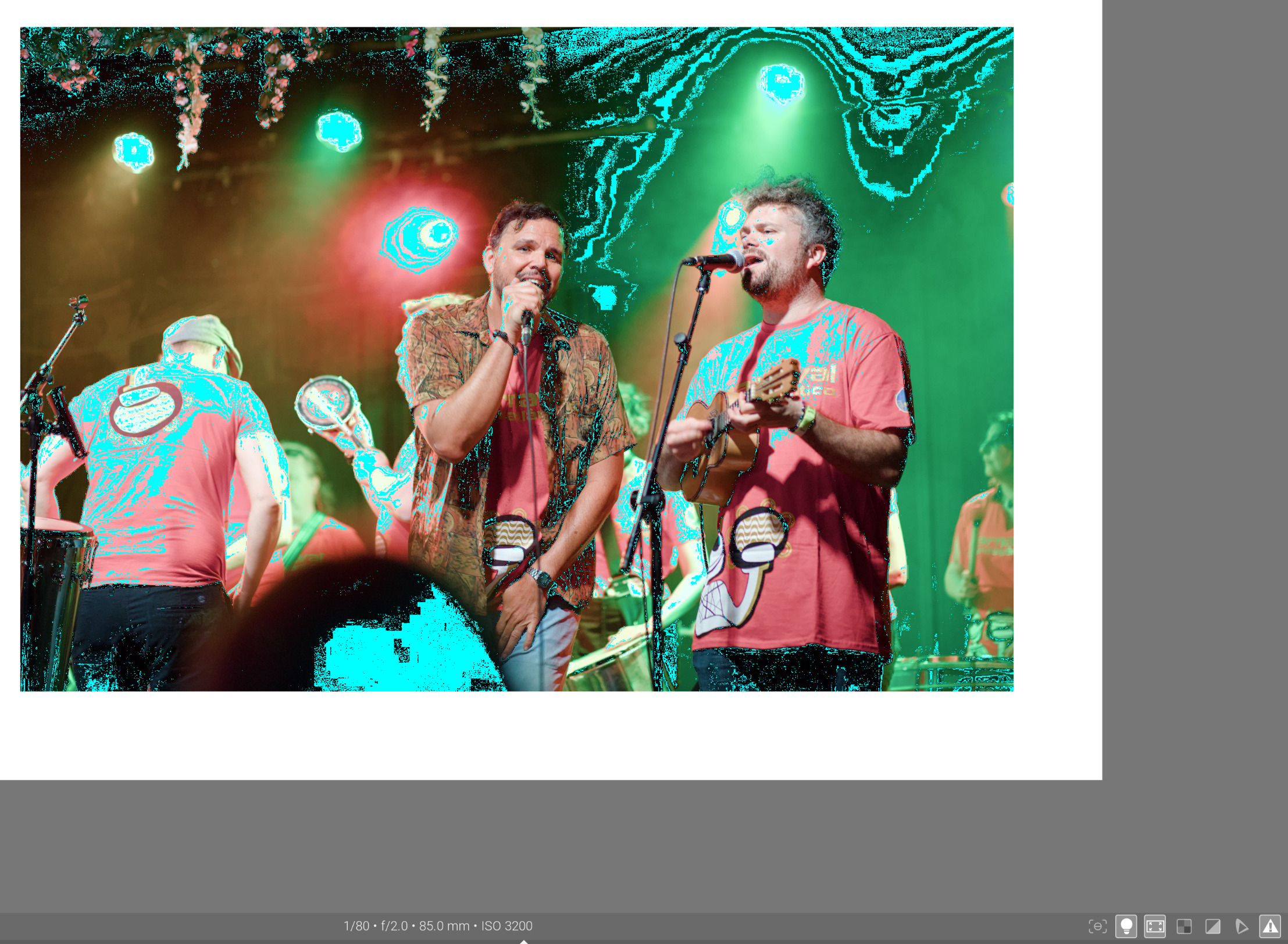 Turning off all but the most necessary modules and dropping exposure reveals that those cyan areas around the lights were not due to per-channel N6, but due to a blown pixels: