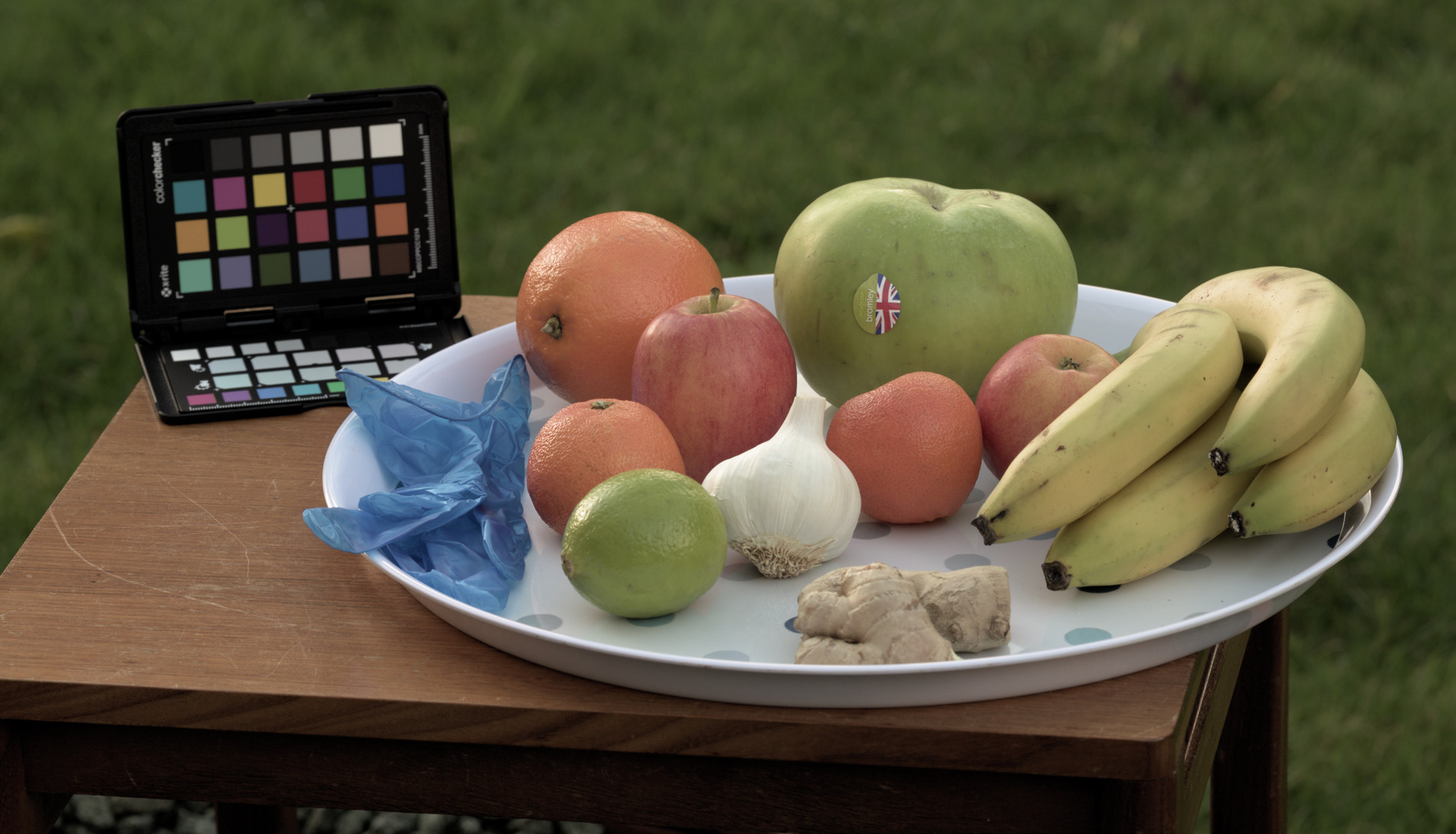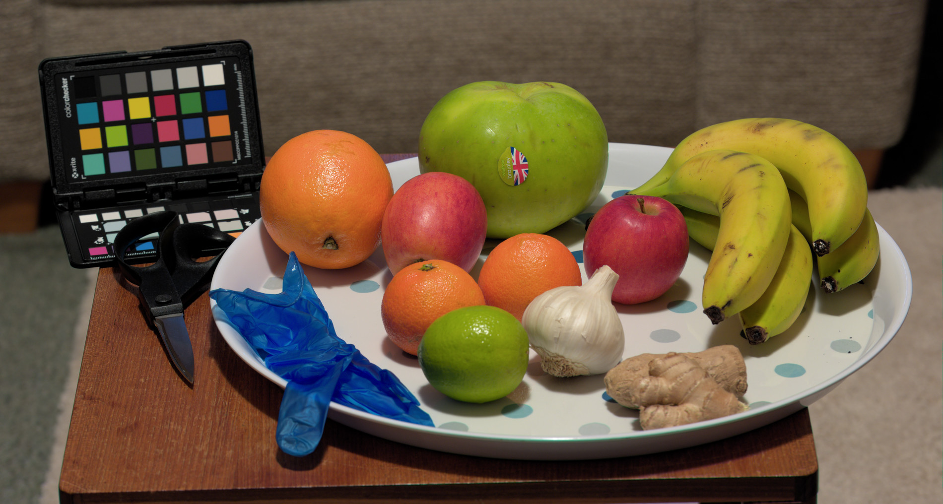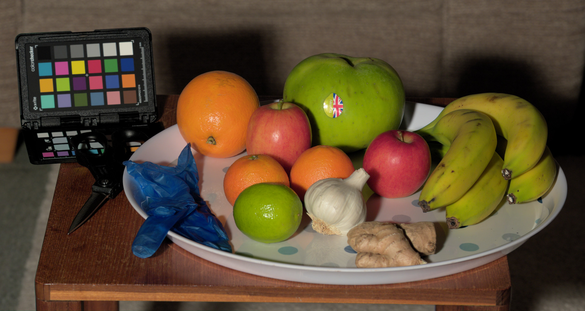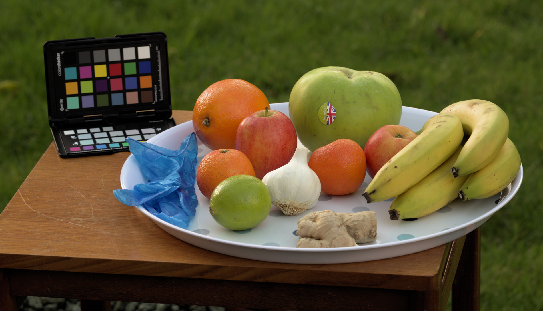 I decided to try out this new module by photographing some familiar objects under different lighting and seeing what happens. In particular, if you’re aiming for true colours, how well does it work? So I’ve shot some food under daylight, fluorescent and tungsten-halogen light. In each case I’ve done a passport checker shot to achieve a calibration, then used that calibration on the objects being used for the test.