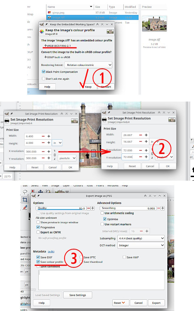 So, if I understand correctly, I import into GIMP without converting (keep existing color profile), use Scale to set the dpi but not change the image dimenstions, and then export as jpg.