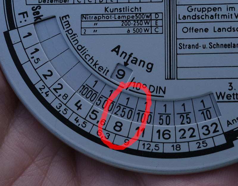 It is 21°DIN or ISO 100 in the shot, but later I noticed that my camera can’t go below ISO 200 or 24°DIN. Luckily that is just the highest possible setting and I changed to that.