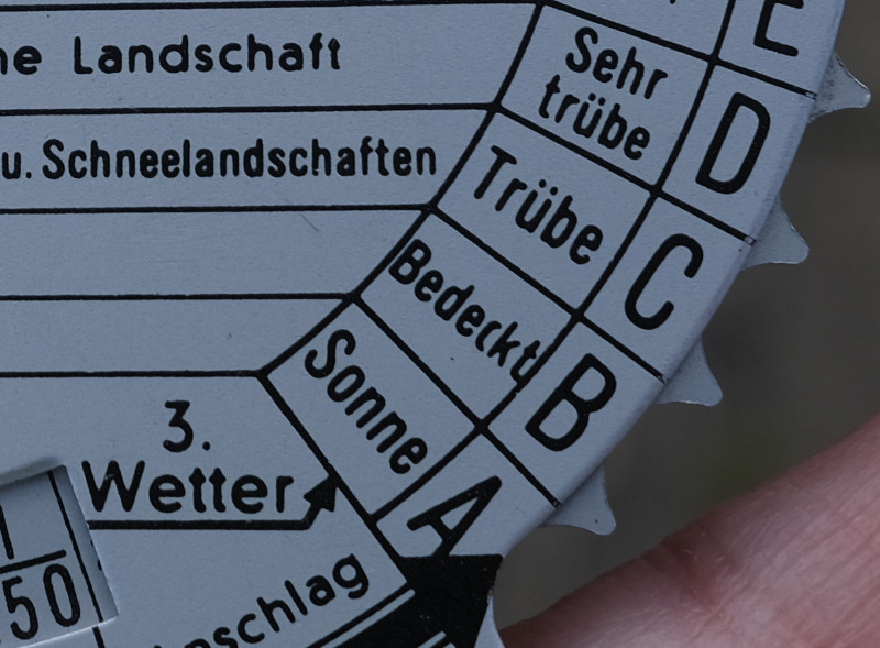 So far, so simple. But it also has a dial to select one of three brightness ranges which introduces neutral density filters into the viewfinder. Select whichever of these allows the gray spot to be extinguished. When reading the exposure, use the shutter speed whose background colour corresponds to the range selector. If you get the wrong exposure scale, the exposure will be wrong by a factor of 100 (6.5 stops). And another selector is for daylight or artificial light.