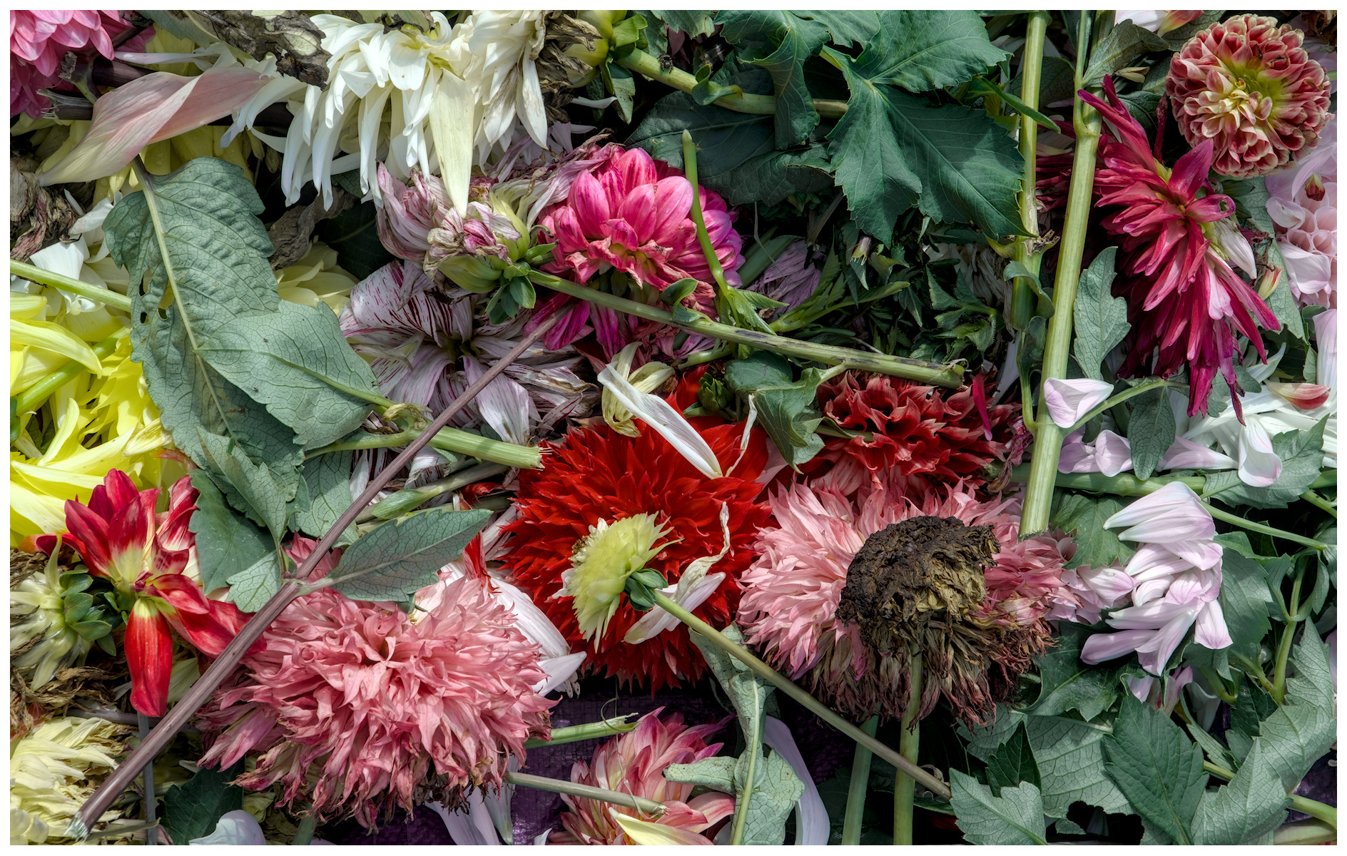 Dhalias being readied for judging. Flowers that are too old, mishapen blooms, limbs that bore undesireable variations (thanks to an octoploid genome), and limbs with no blooms are cut off and discarded in a large pile. Judging takes place shortly after each “trim”. That pile is carted away to a non-public compost pile, to prevent people absconding with cuttings which they could propogate. Tubers from striking plants were already selling for $100+/ ea. The plant with the highest point total could sell tubers at higher prices (per the judge).