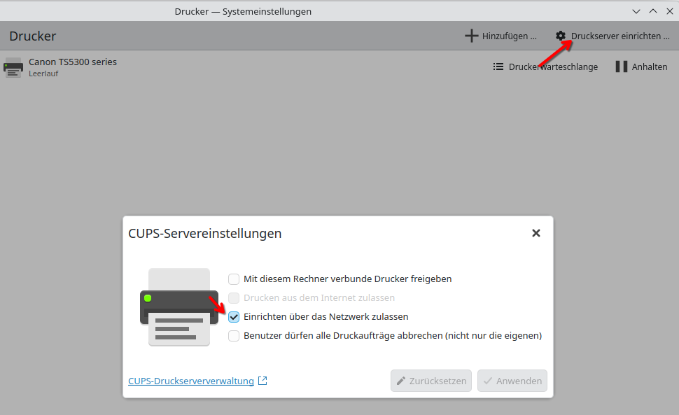 After activating “Setup printing server” (top right on the screenshot) / Allow setup via network (loose translation, don’t know if those things are actually named this way in english KDE) the printer appeared and I am able to print now.