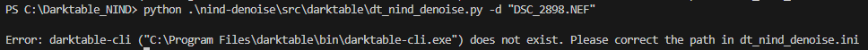 Error: darktable-cli ("C:\Program Files\darktable\bin\darktable-cli.exe") does not exist or not accessible. Please correct the path in dt_nind_denoise.ini