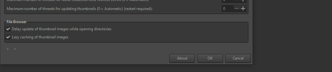 When I first click on a thumbnail in the file browser (just to select, not open*), it takes a second or two before the highlight shows up on the thumbnail border and it’s visually selected. If I select another image and go back to the first, it’s instantaneous. If I go to yet another “first-time selected” image there’s a slight delay again. If I open an image in the editor and then click from image to image using the arrow buttons, the images I’ve opened are thereafter quick to select in the file browser. So thunbnails are quick after their first selection.
