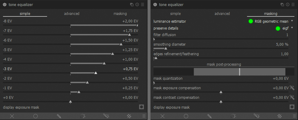 Then I’d give slight boost in overall exposure (adjusting the mask in Tone EQ may be needed), another instance of Tone EQ to bring back contrast in the midtones - important not to alter the first and last band, we don’t want to introduce clipping:
