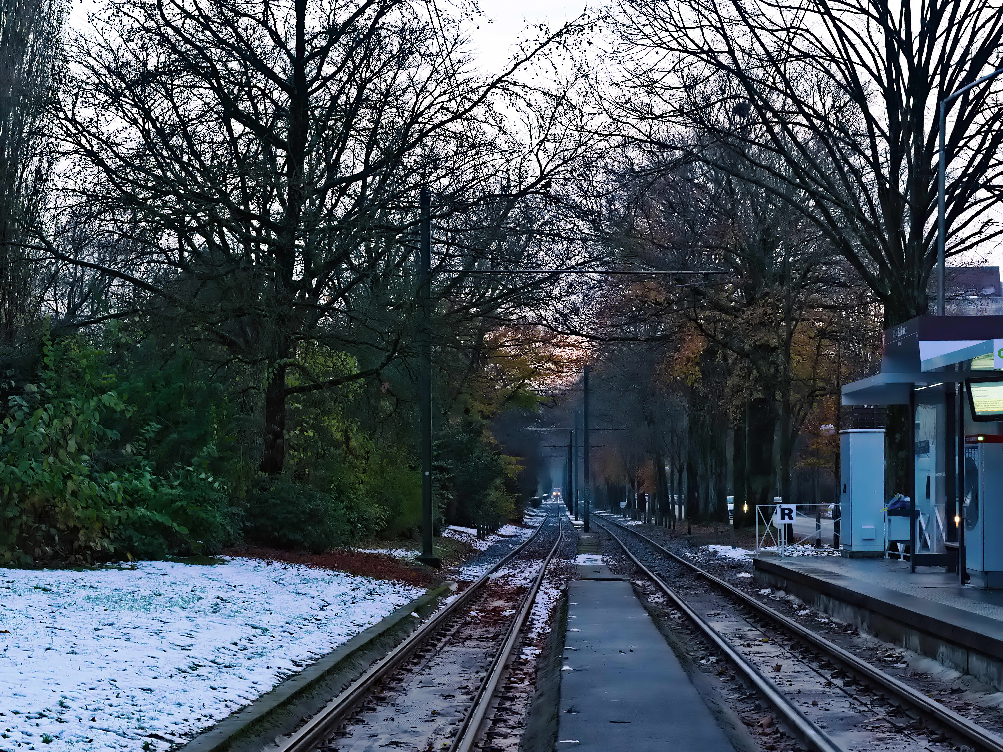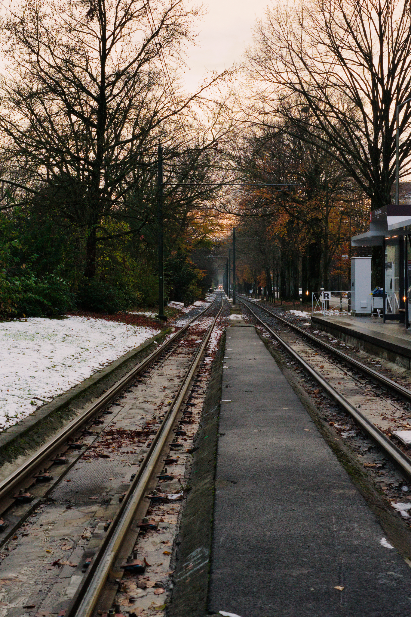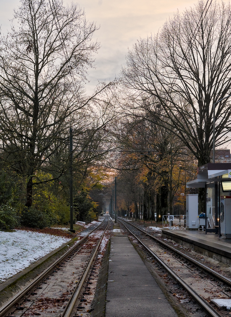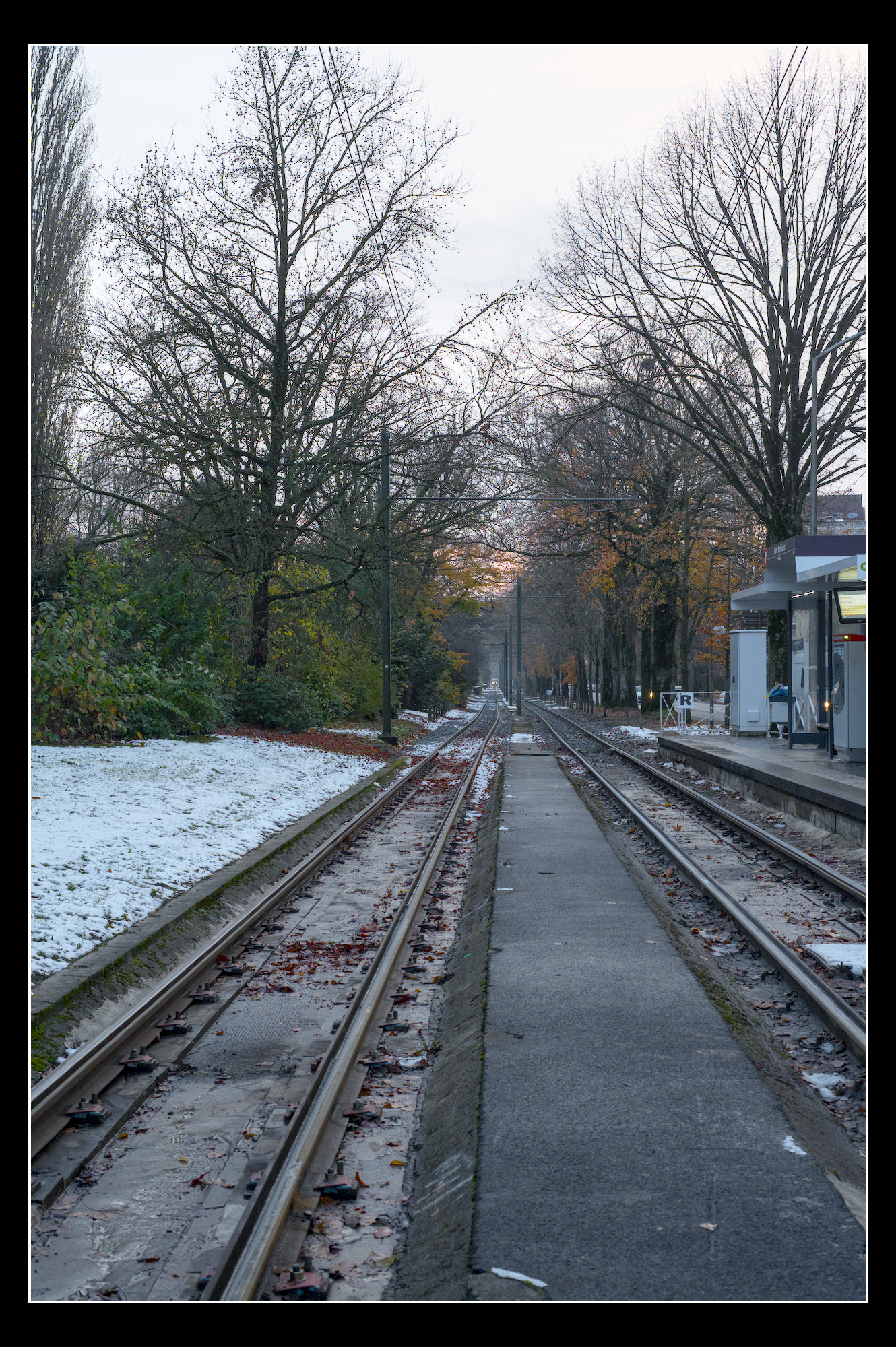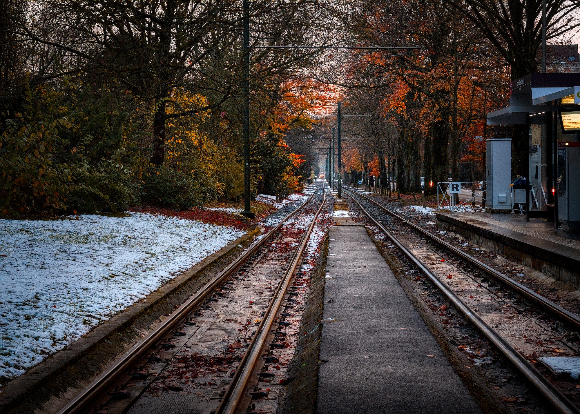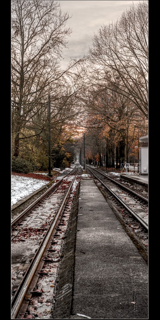 I think the kink in the rails is challenging creating conflicting leading lines. Emphasised red and orange. And softened contrast everywhere except the middle, though might have gone overboard with the Vaseline.