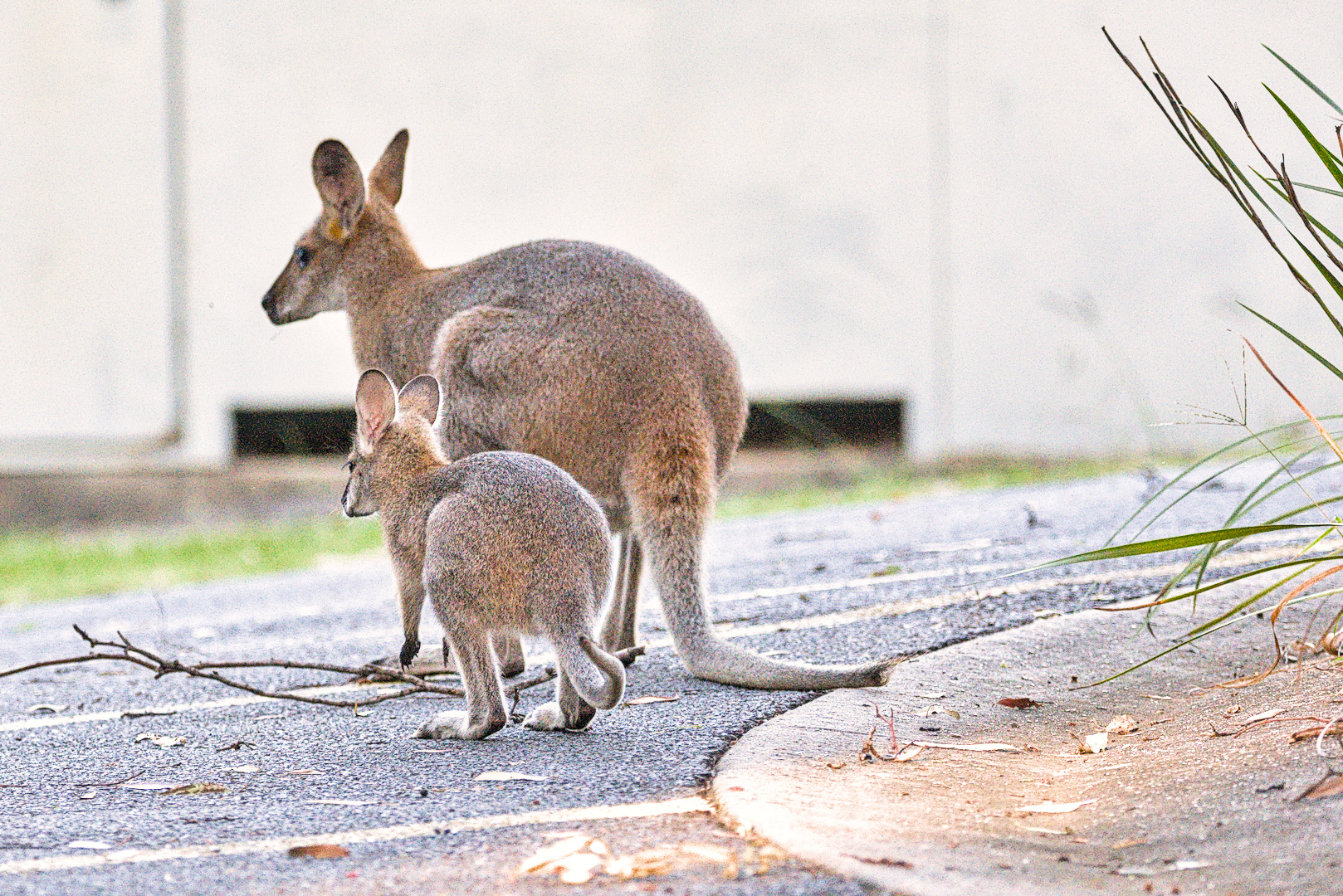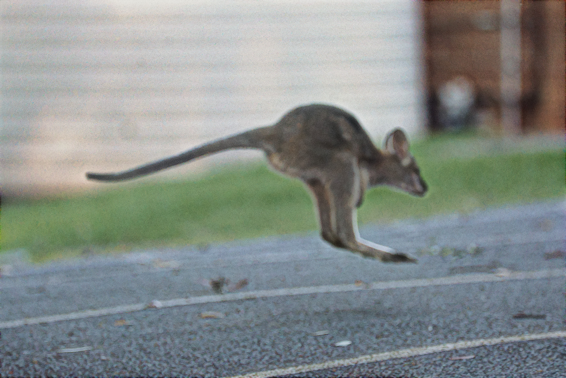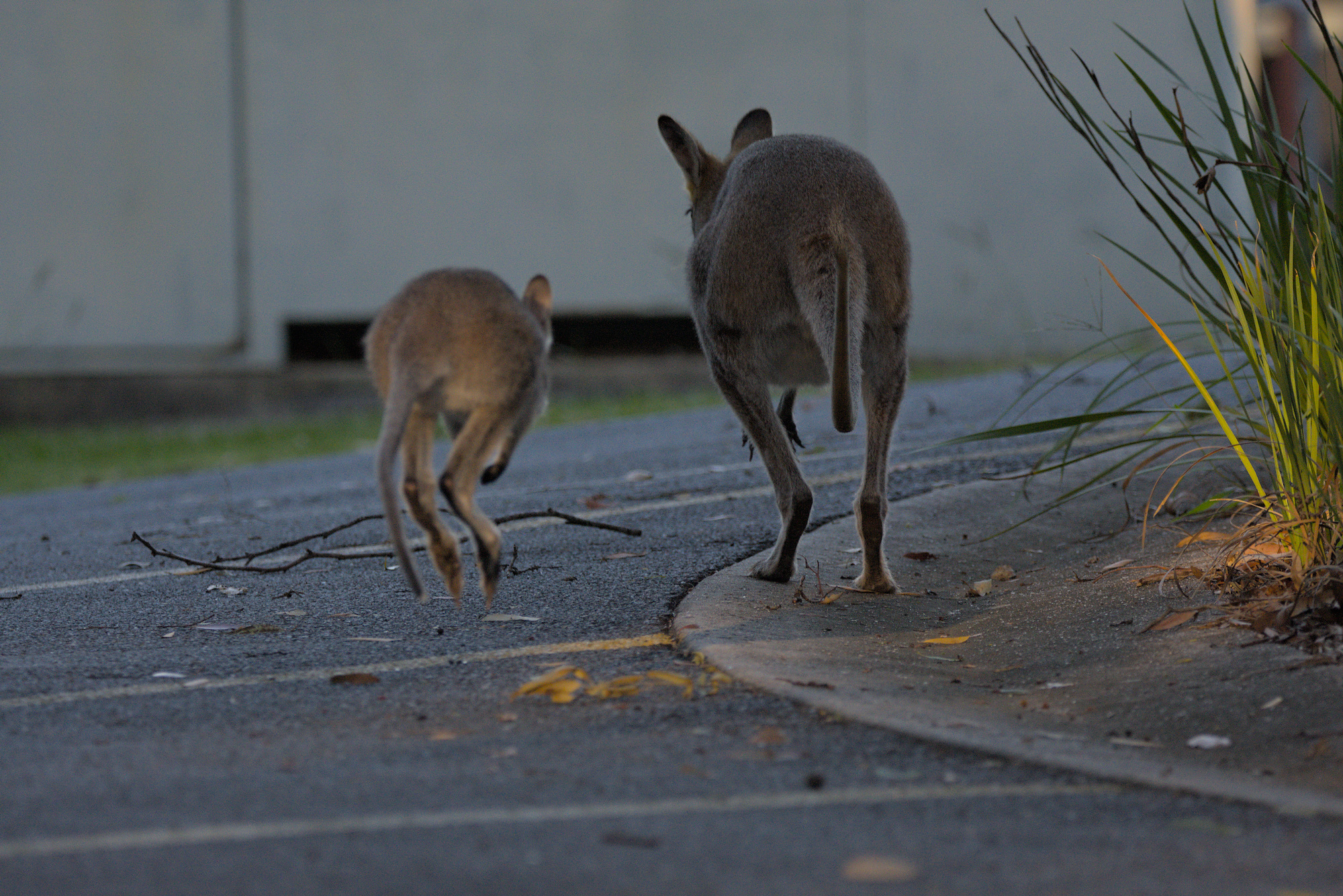 In low-light conditions as I was finishing work earlier this week, I saw many wallabies, including this juvenile with its mother. This is my preferred capture, because it portrays the dynamics of the animal best. Problem is, my AF tracking had not managed to keep up with the rapid movement (or maybe it was operator error ). Some say that perfectly sharp focus is not always necessary, and point to some of the work of Ansel Adams, for example.