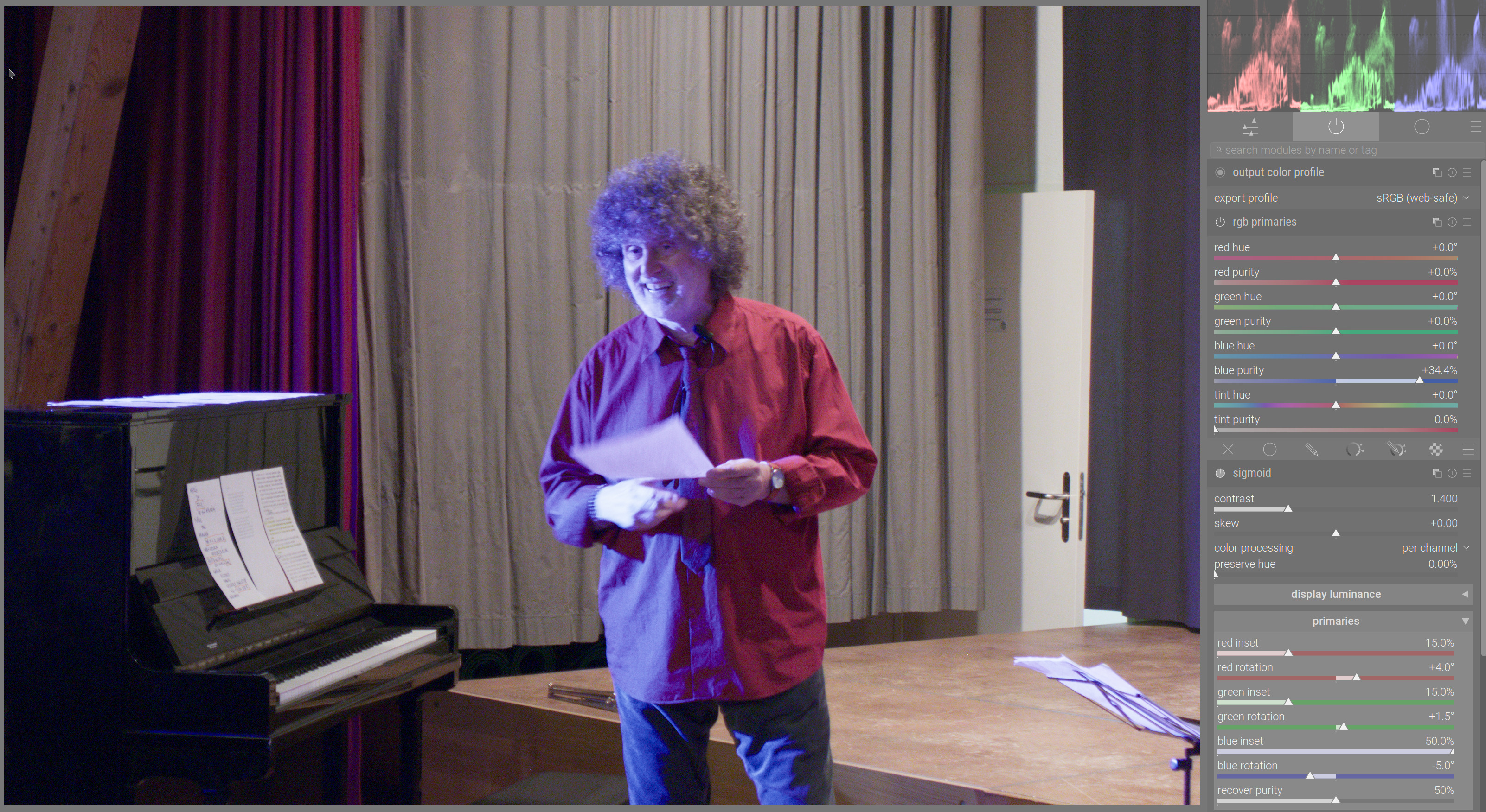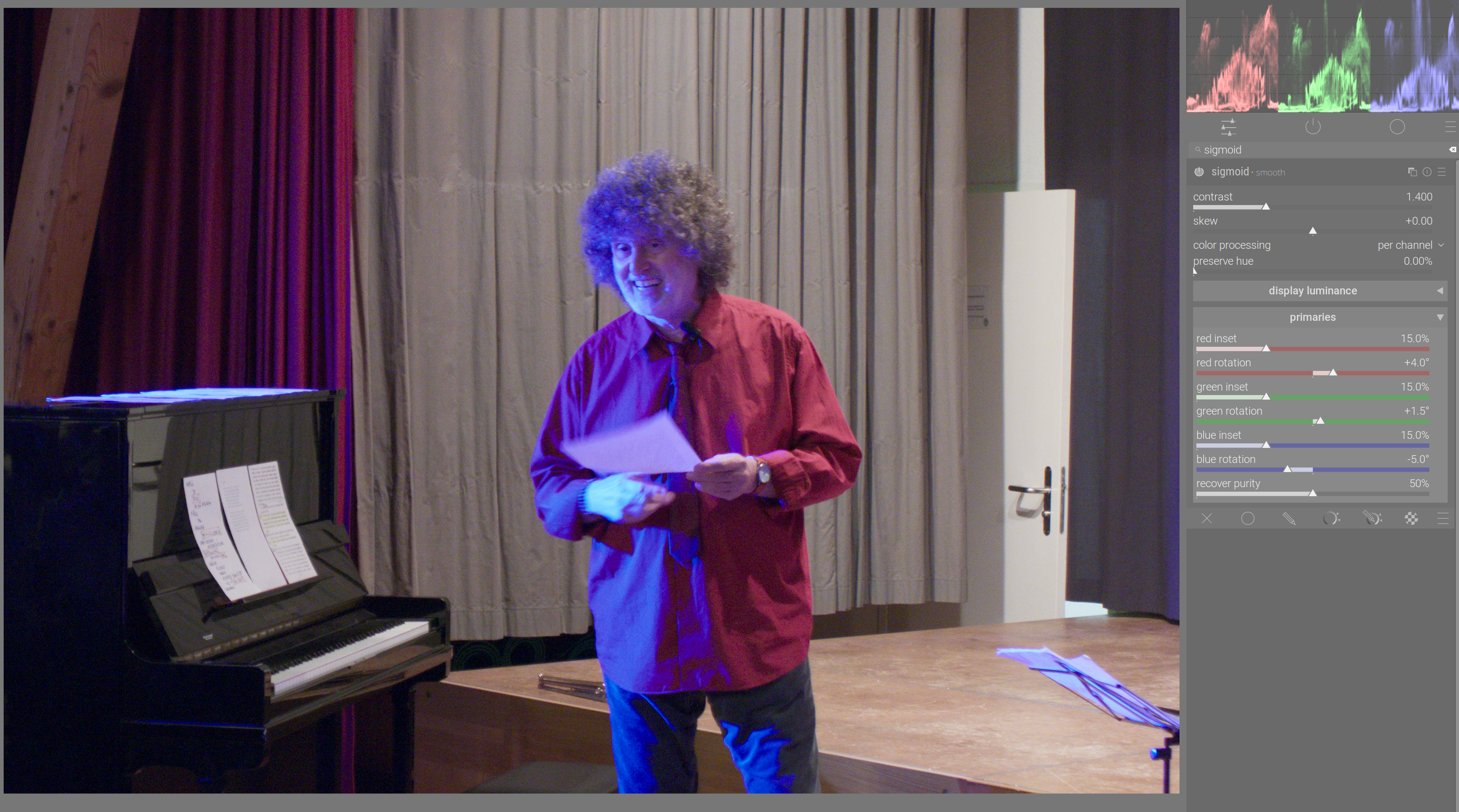 sigmoid with settings based on the new ‘AgX-like’ smooth preset, but with the primaries reset to neutral values (contrast: 1.4, per-channel processing, preserve hue: 0%):