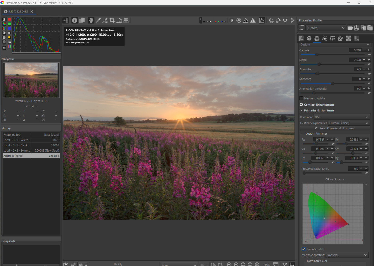 To make the settings easier, set the ‘gamut’ knob so that the data and histogram use the same values as those – linear + working profile. During the process, you will regularly switch to viewing the histogram in gamma + output profile mode to see any overshoots caused by these changes and try to correct them.