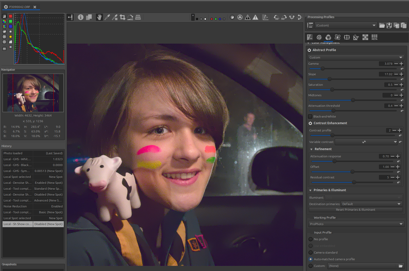 Of course, there are other ways to do it, for example, adding RT-spots in ‘Normal’ mode to process specific parts of the image (Color & Light, Denoise, etc.). You can also use CIECAM (Color Appearance & Lighting), for example, to perform color matching (chromatic adaptation), the image temperature is close to StdA (2825 K).