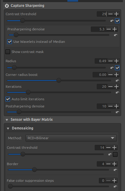 Open a third RT-Spot in Global mode and choose ‘Add tools to current spot…> Sharpening > Capture Deconvolution’. Can you leave the default settings or change them.