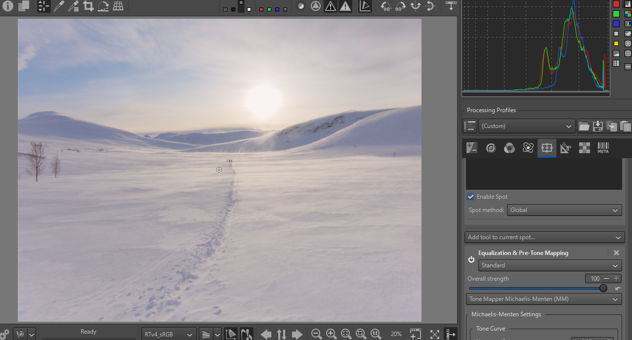 To ensure (and this is one of the essential goals of the tutorials) that you are not out of gamut, I recommend enabling Softproofing in RT, along with your output profile, which should very often be sRGB. It’s easy to create pleasing images… but beware of the color gamut.