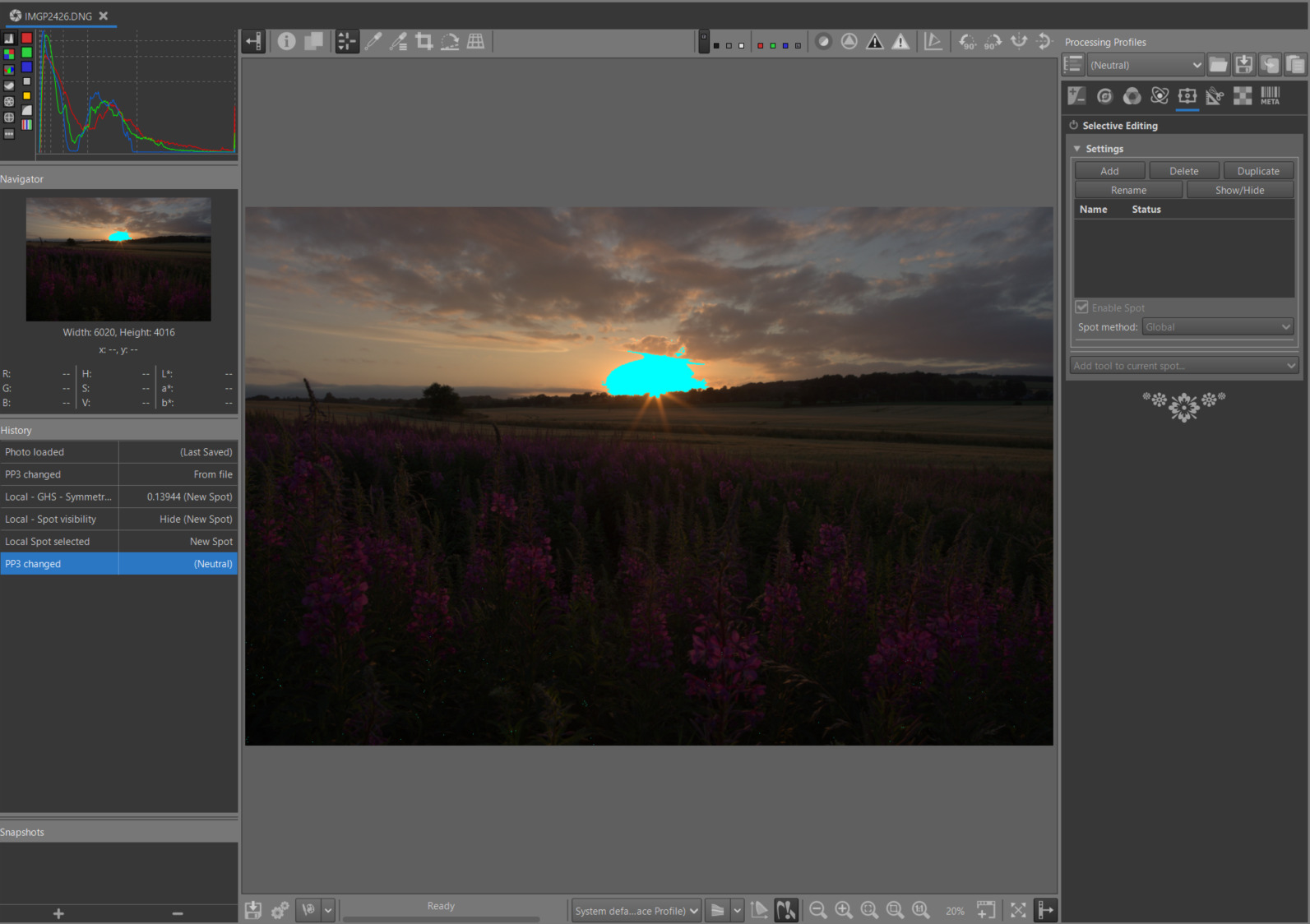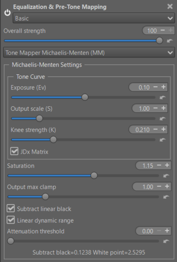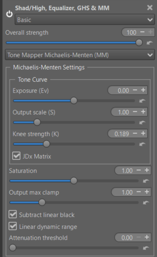 I added the ‘Michaelis-Menten’ (MM) algorithm to Selective Editing. This algorithm has the advantage of being simple for the user and is very efficient in most cases. It’s a tone mapper using the Michaelis-Menten equation, which is borrowed from biochemistry to describe enzyme kinetics .